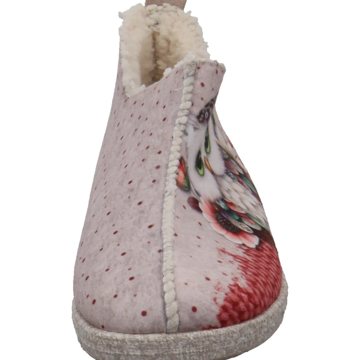 Das Obermaterial ist aus Textil in Rosa, mit einer Eule und einem hinterlegten Strickmuster in Rot, welches den Schuh zu einem tollen Blickfang macht. Punkte in Rot auf der Innenseite sind ein weiterer Eyecatcher. Dabei sorgt das flauschige Innenfutter für warme Füße. Die Schnittführung des Hüttenschuh, sorgt für perfekten Halt am Fuß und verleiht dem Schuh eine modernen Look. Die Textillasche am Schaft hilft dir bei einem leichten Einstieg.