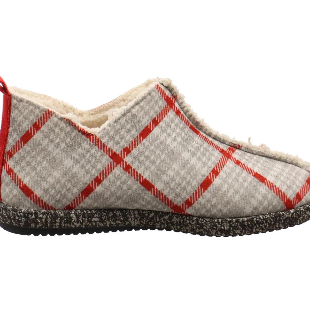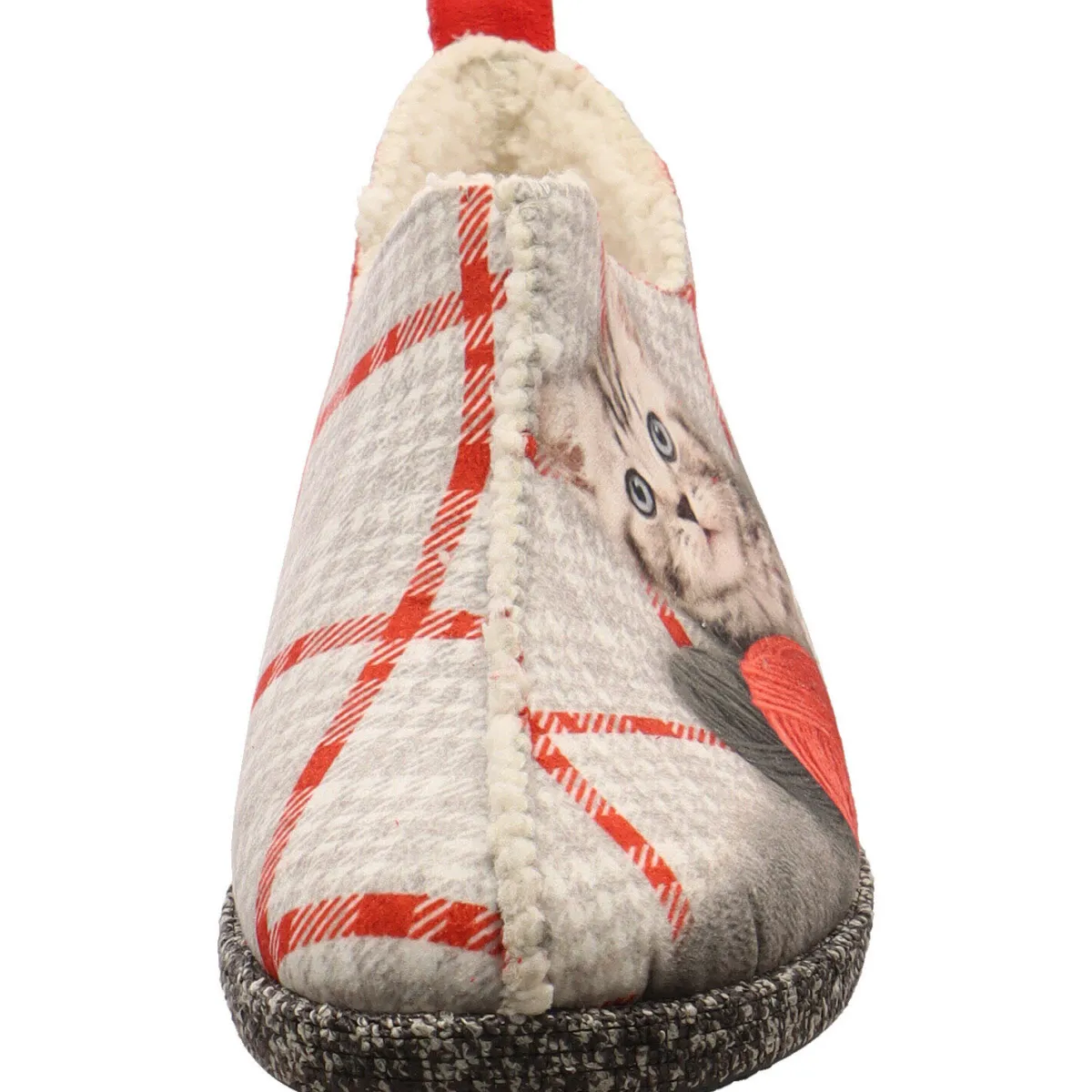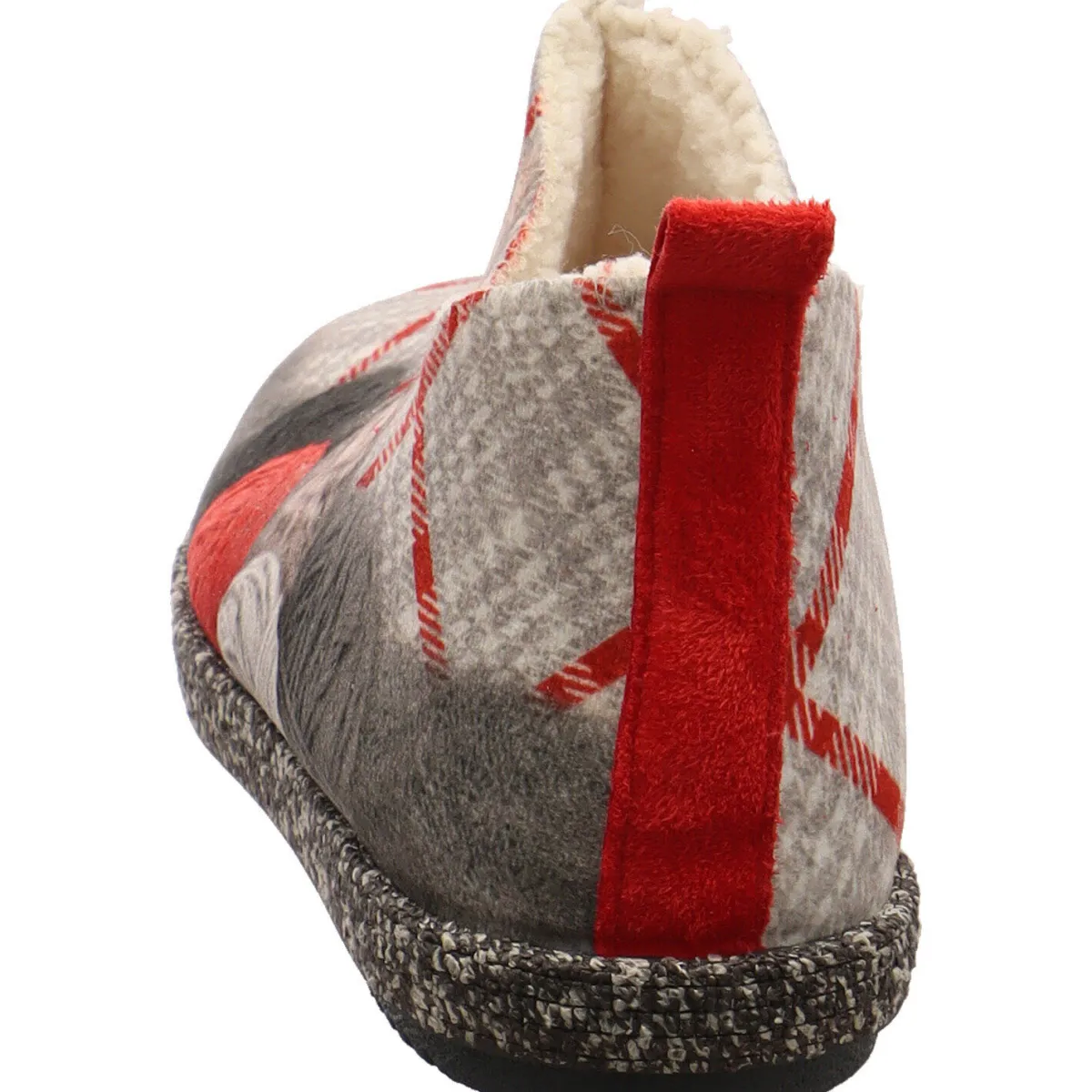Das Obermaterial ist aus Textil in Grau, mit einer Katze und einem hinterlegten Karo Muster mit Details in Rot, welches den Schuh zu einem tollen Blickfang macht. Dabei sorgt das flauschige Innenfutter für warme Füße. Die Schnittführung des Hüttenschuh, sorgt für perfekten Halt am Fuß und verleiht dem Schuh eine modernen Look. Die Textillasche am Schaft hilft dir bei einem leichten Einstieg.
