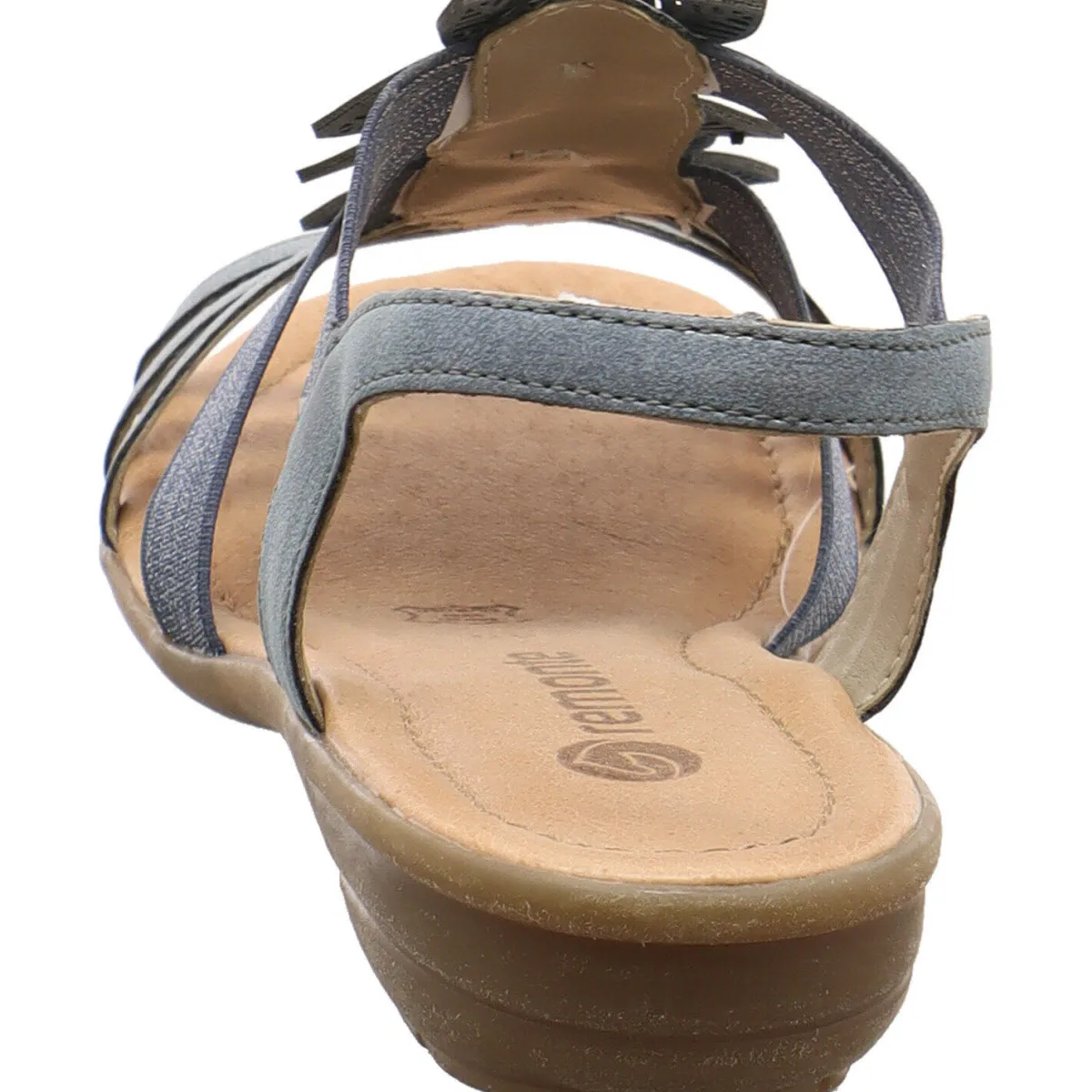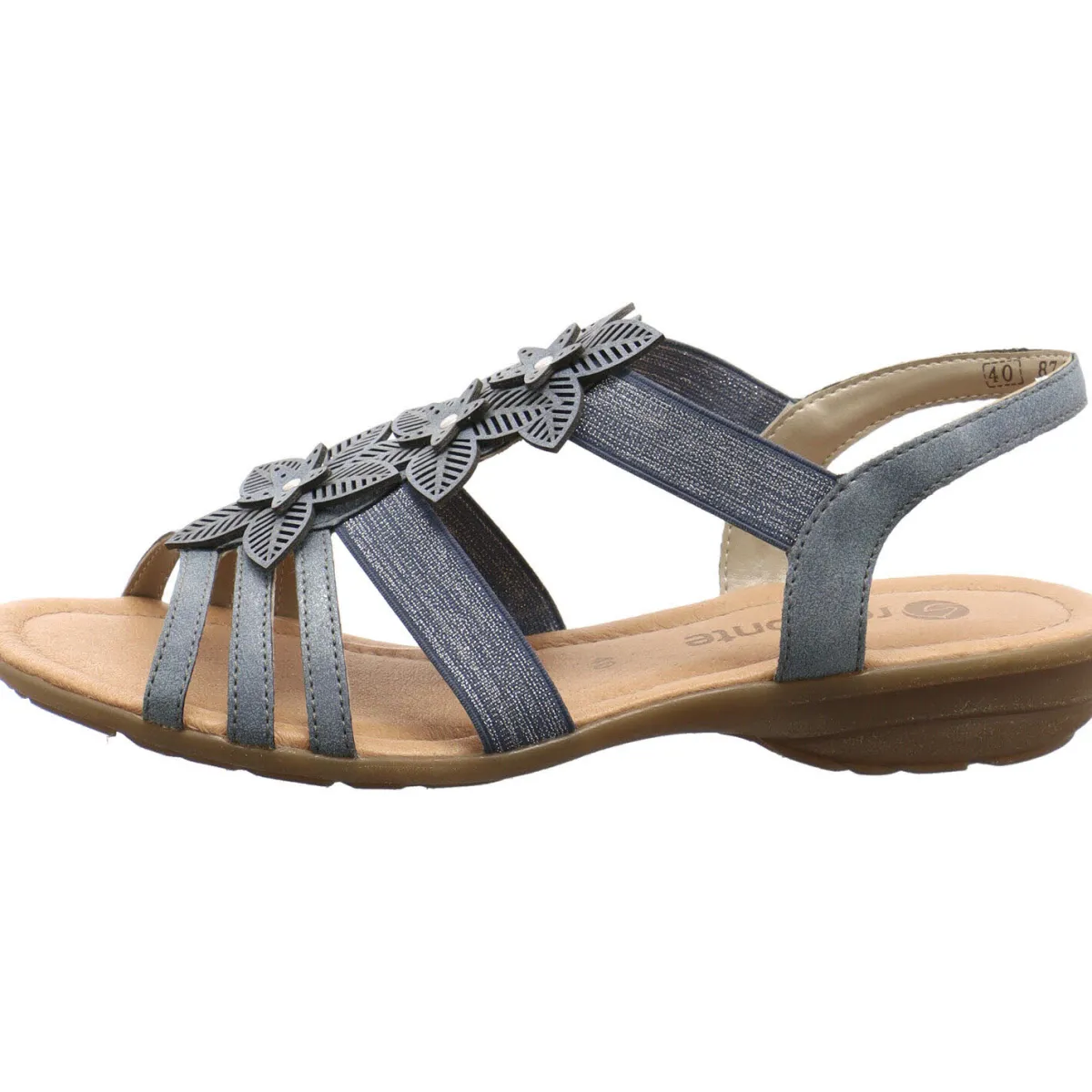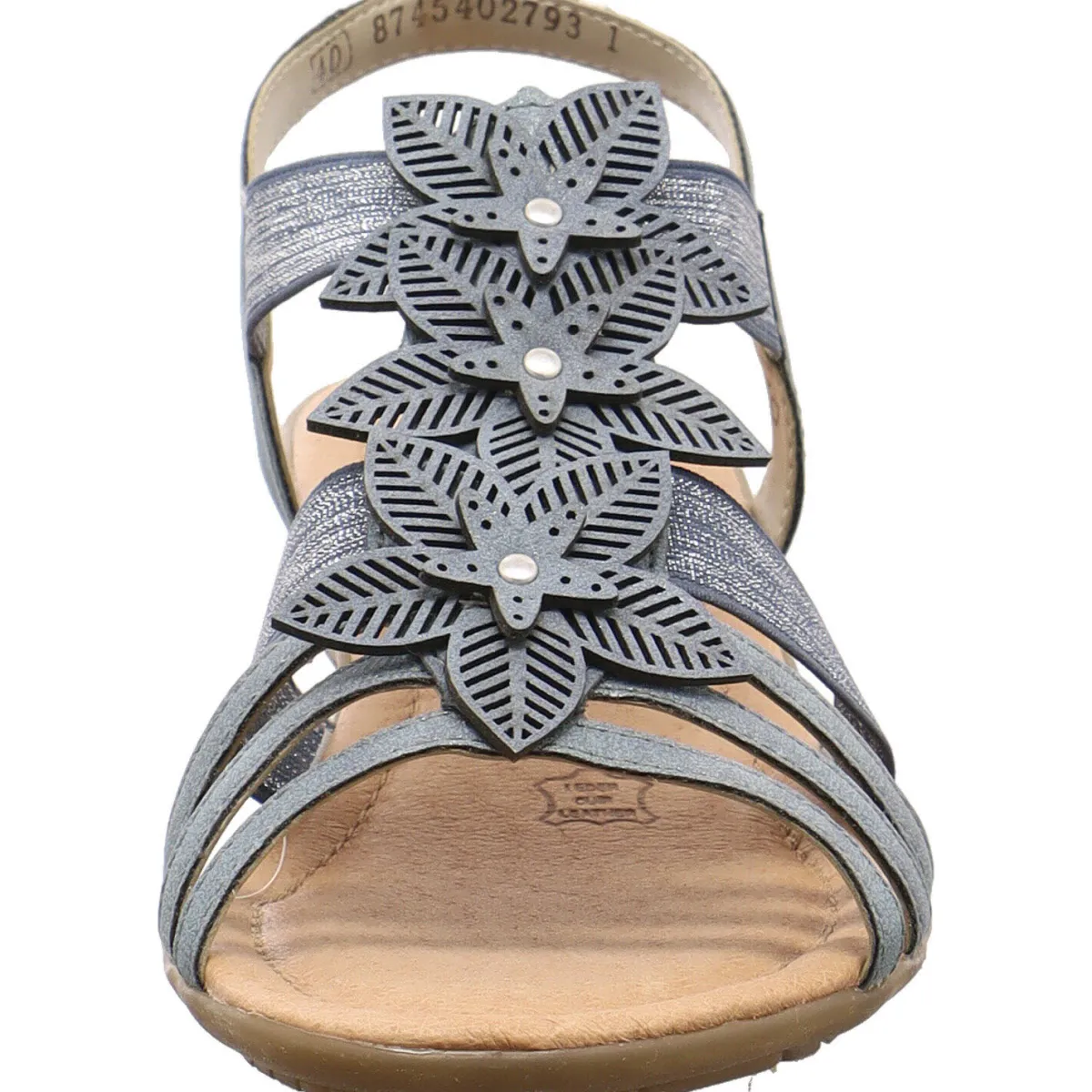 Das Obermaterial aus Kunstleder in dunklem Blau fällt besonders durch den mit toll gestalteten Blumen besetzten Rist ins Auge. Die Riemen sind mit schimmernden Akzenten in Silber versehen, was für einen angesagten Look sorgt.