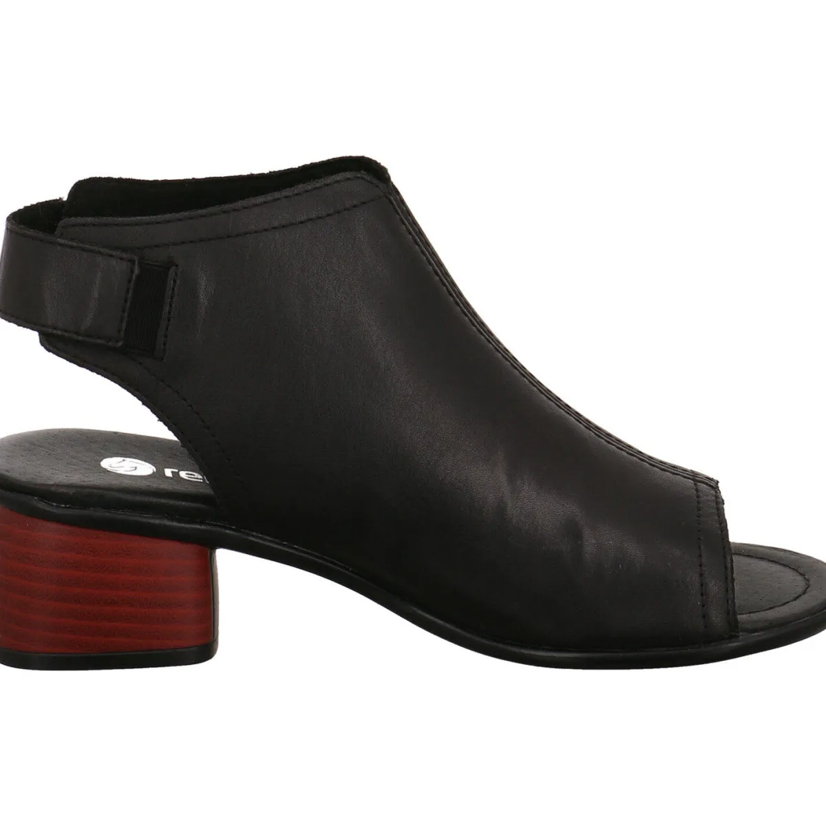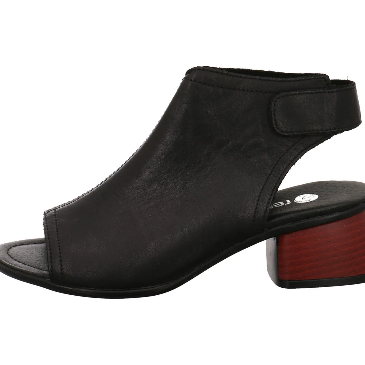 Der modische Look wird durch den offenen Zehenbereich und den markanten Blockabsatz in Holzschichtoptik in Rot noch unterstrichen.
