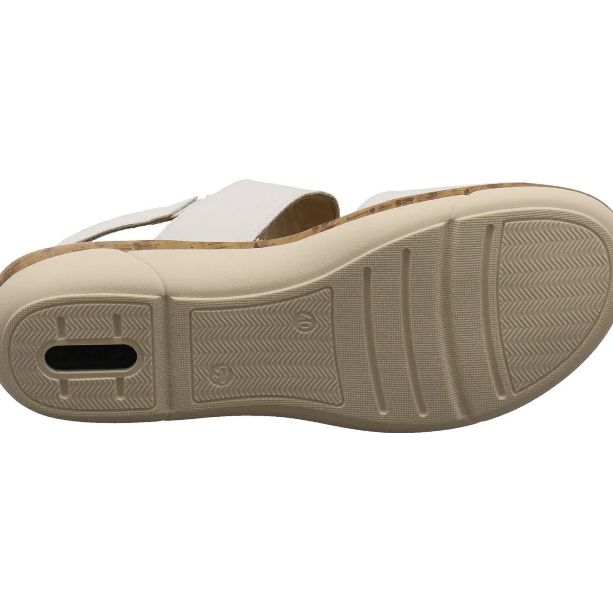 Die bequeme Laufsohle in Weiß hat eine Umrandung in Kork Optik und passt toll zum sommerlich frischen Design.