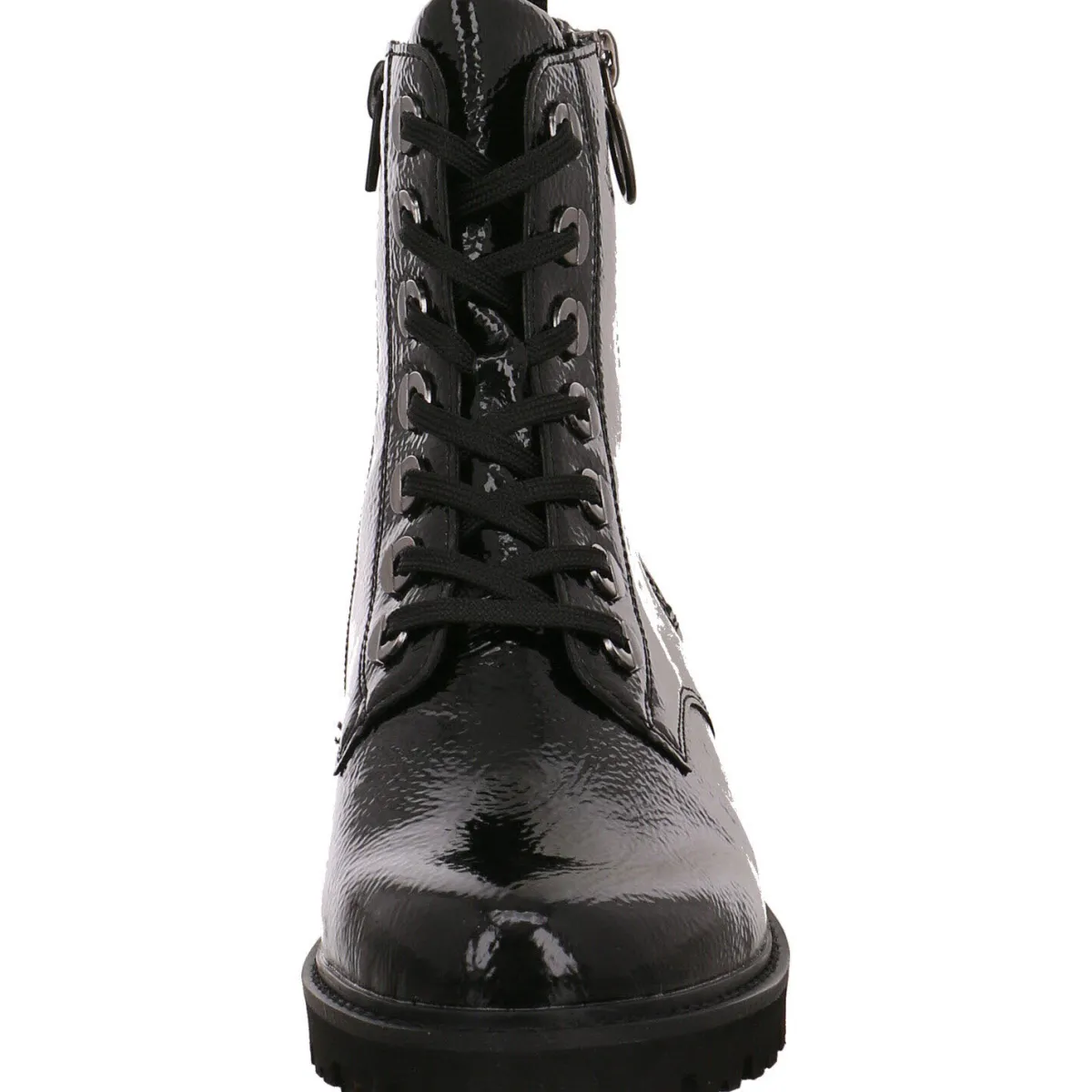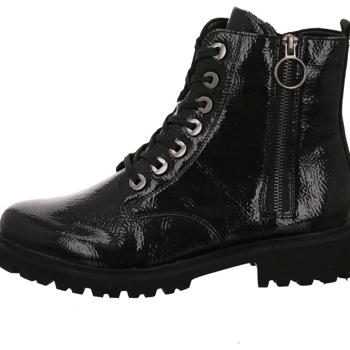 Gefertigt aus Kunstleder in Schwarz mit auffallender Lack Optik fungiert der Schuh als schicker Eyecatcher. Highlights sind die Metallnieten an der Schnürung und der Zipper an der Außenseite.