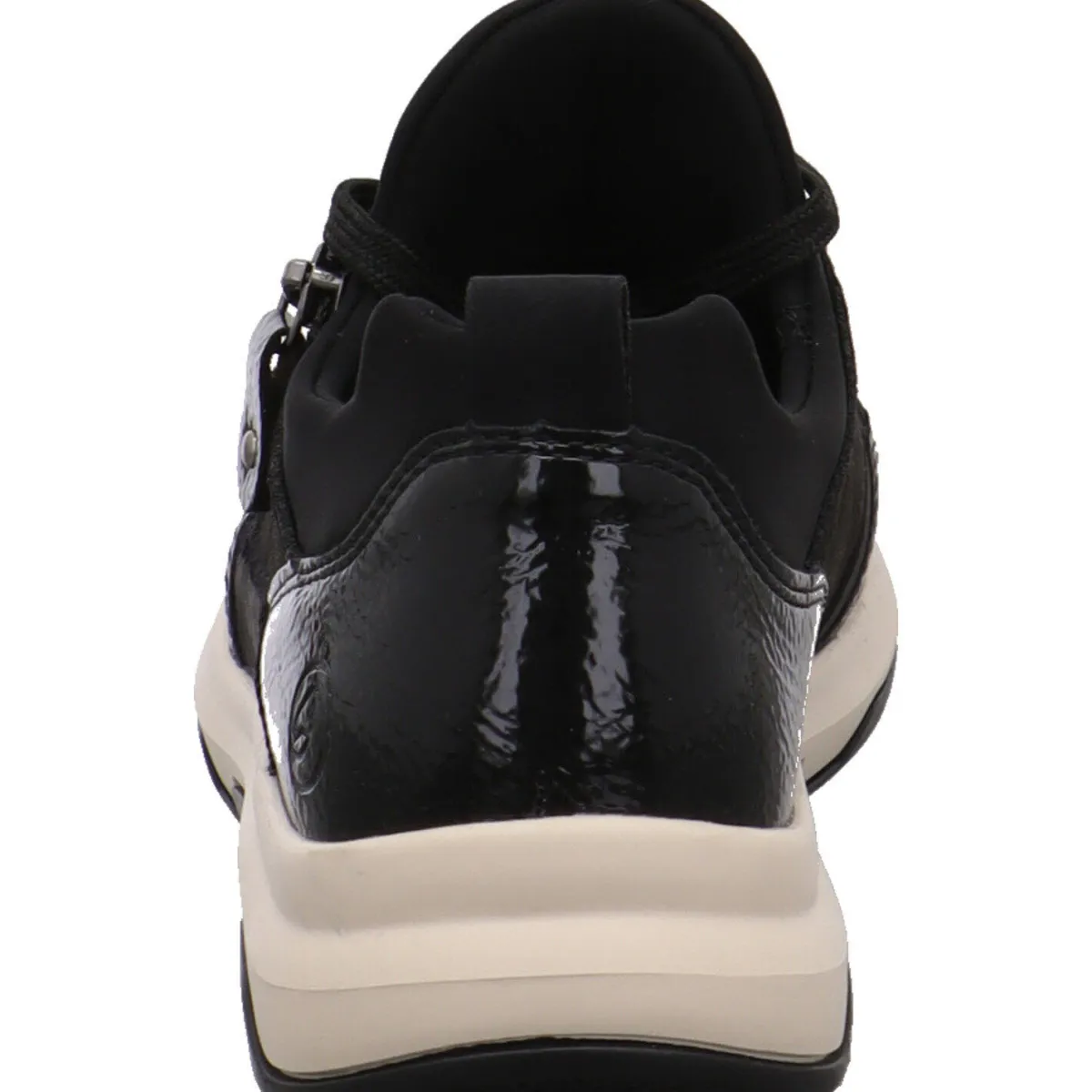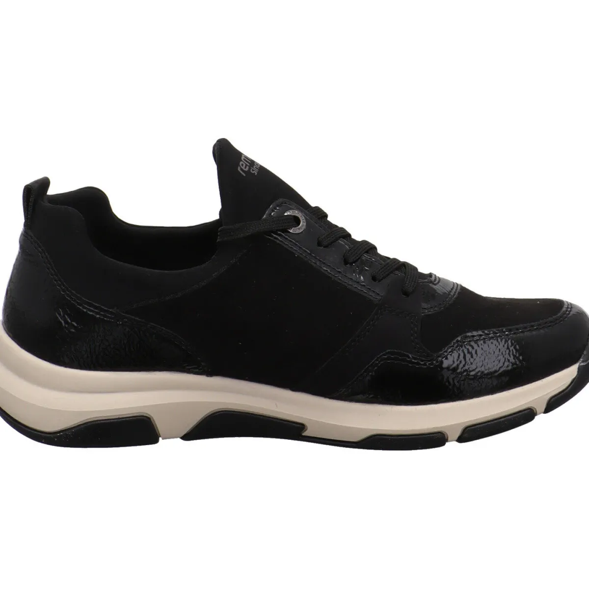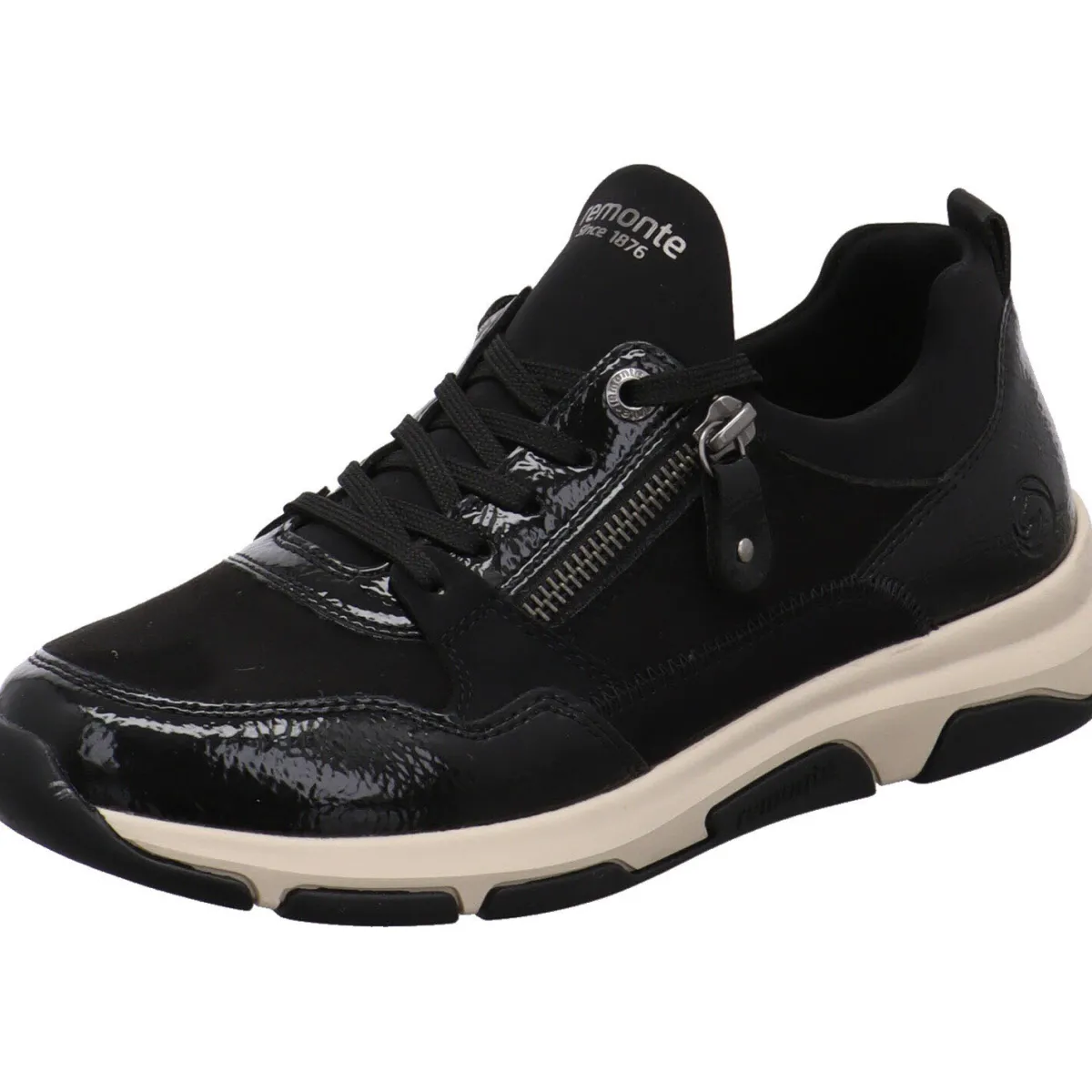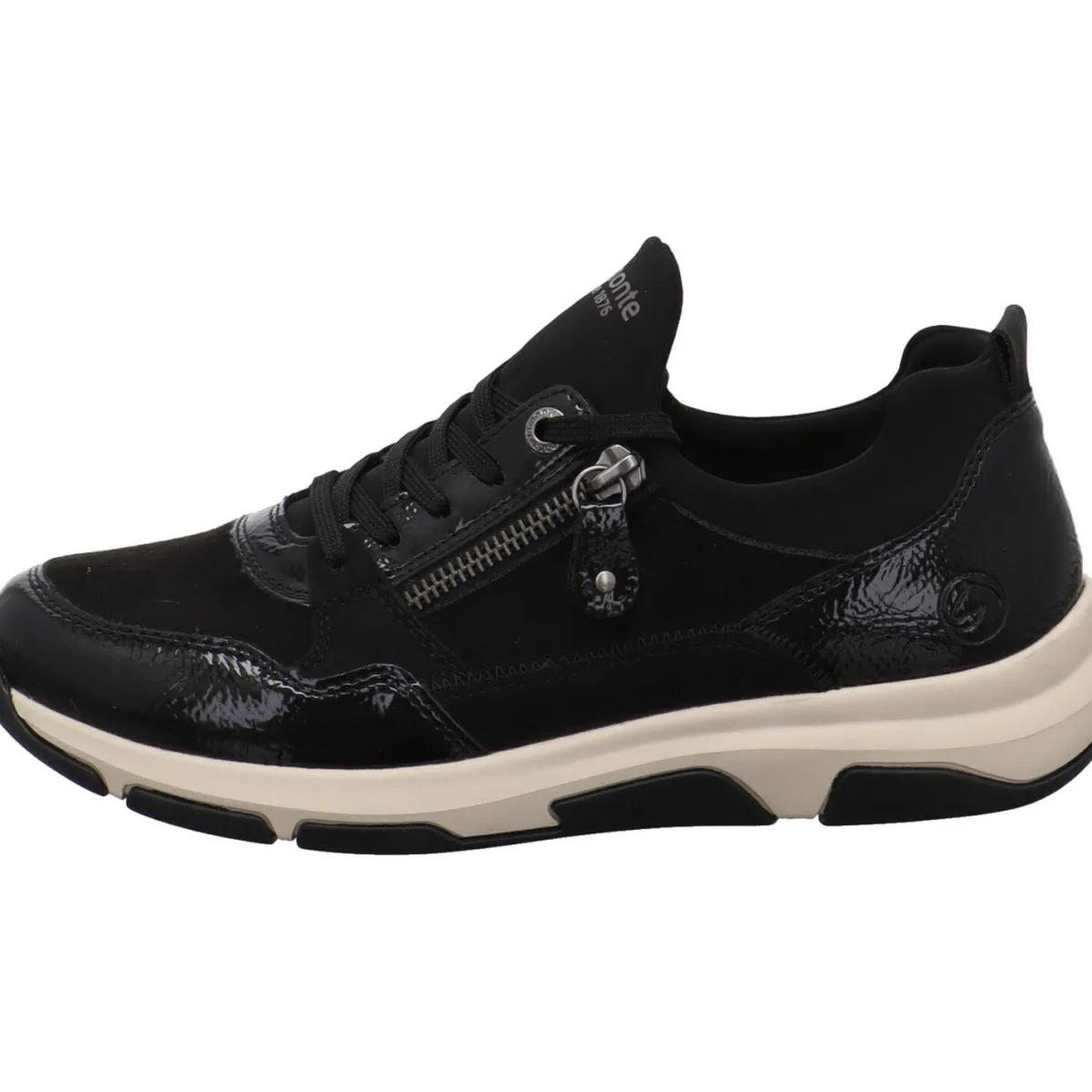 Das Obermaterial wurde aus einem gekonnten Mix aus Kunstleder und Textil in Schwarz gefertigt. Er begeistert durch seine untschiedlichen Haptiken und den Lack Einsatz. Durch den Stretch Einsatz am Schaft ist der Einstieg ganz einfach und mit der Schnürung kann der Schuh genau auf deine Bedürfnisse angepasst werden. Der Zierzipper ist dabei ein toller Eyecatcher. Die Remonte Soft Innensohle ist angenehm weich gepolstert und im Vorderfuß perforiert. Zudem ist sie als Wechselfußbett gearbeitet. So kannst du auch eigene Einlagen verwenden.