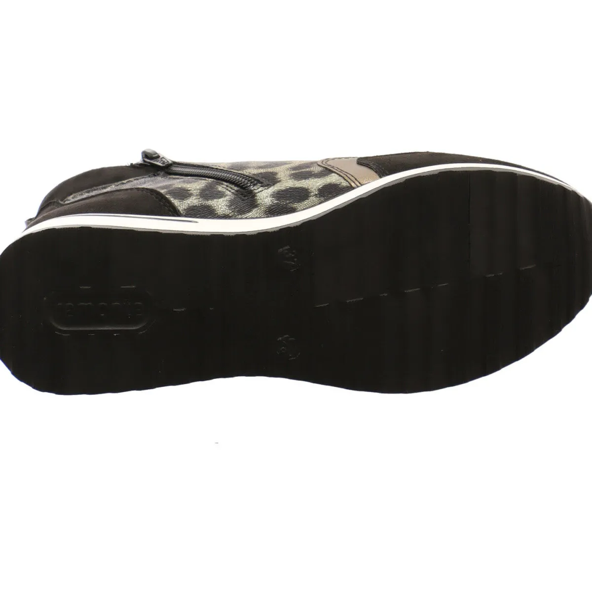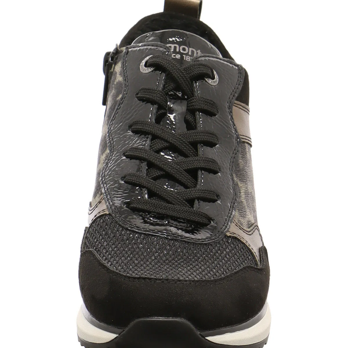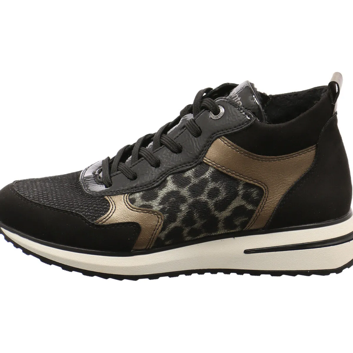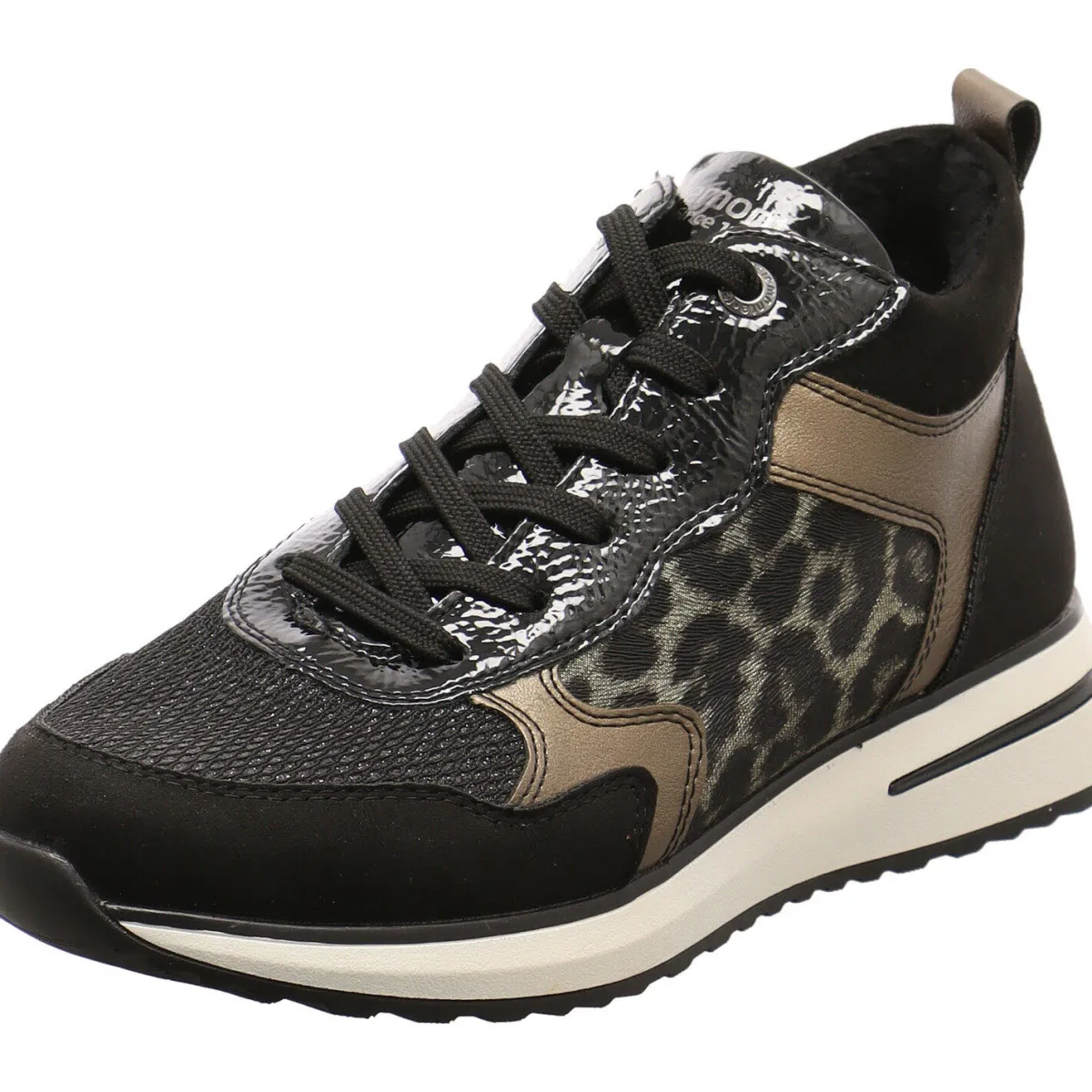 Das Obermaterial in einem gekonnten Mix aus Textil und Synthetik in Schwarz, ist mit einem Glitzerschimmer auf dem Mesh Gewebe versehen. Seitliche Einsätze in Bronze und ein Animal Leo Print und die Umrandung der Schnürsenkelösen in Lack, runden den modischen Look perfekt ab.