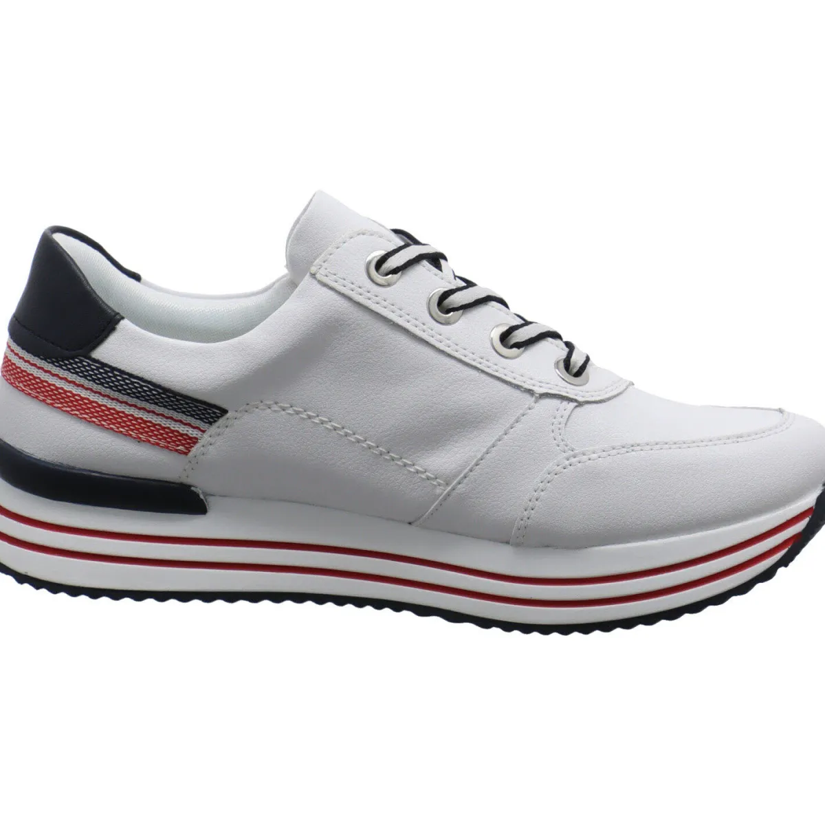 Die Schnürsenkel und die Laufsohle im Streifen Look mit Rot runden das moderne Design gekonnt ab. Der seitliche Reißverschluß hilft zusaätzlich bei einem leichten Einstieg. Die Remonte soft Innensohle als Wechselfußbett ist besonders atmungsaktiv und Schock absorbierend.