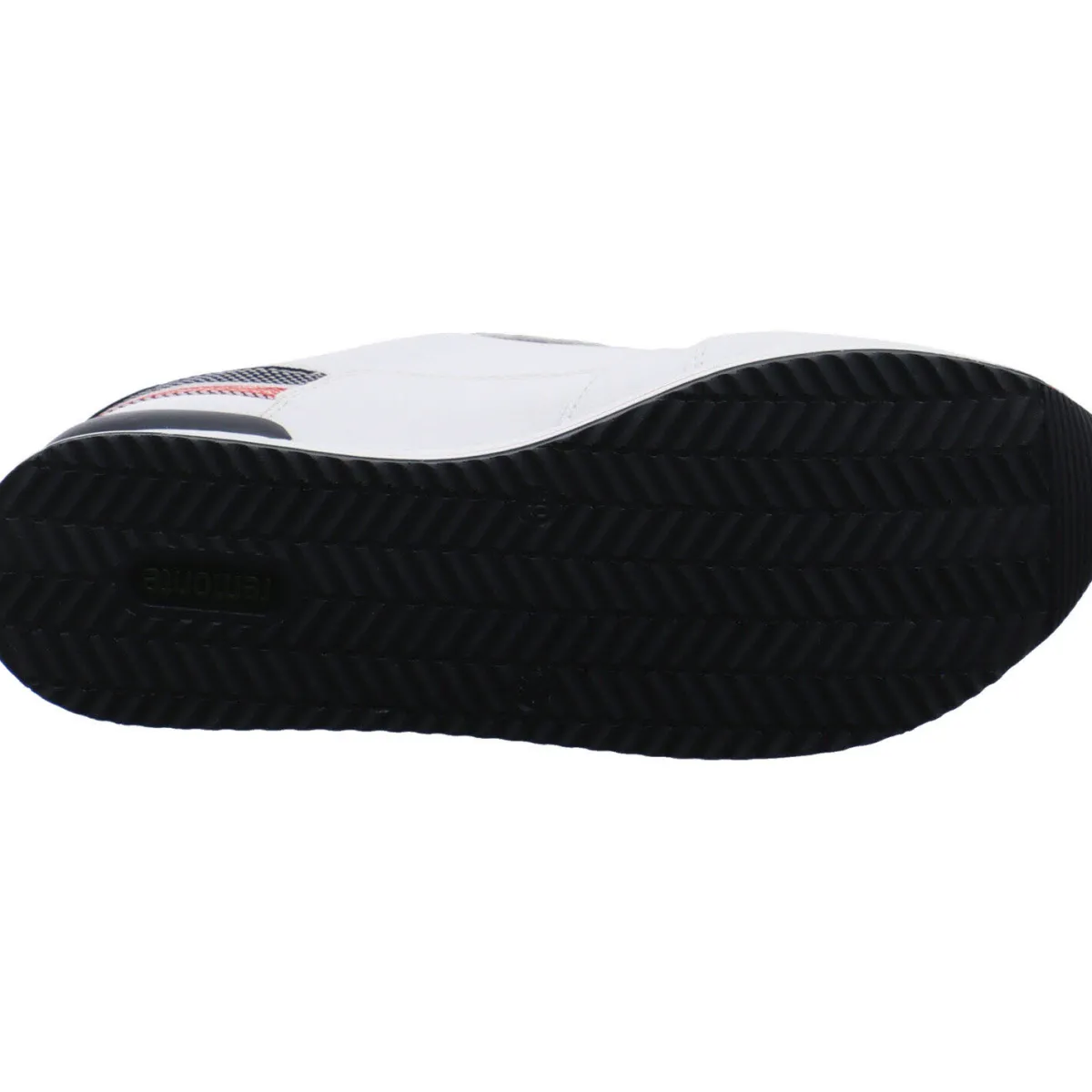 Das Obermaterial aus Leder in Weiß wurde mit vielen kleinen Details versehen. So finden sich an der Ferse sowie am Schaft Einsätze in dunklem Blau und ein Textil Band mit den Farben Rot und Blau.