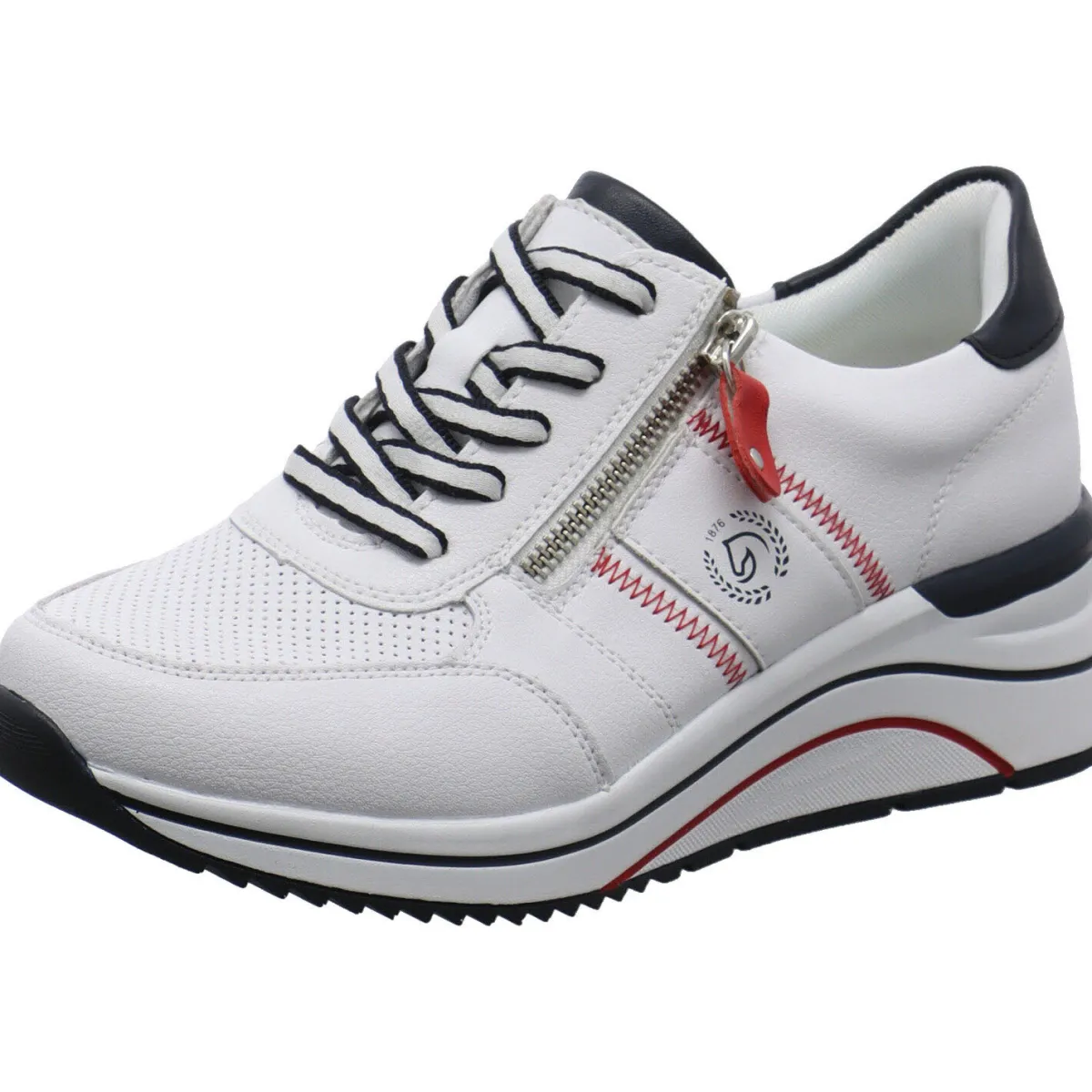 Das Obermaterial aus Leder in Weiß, ist auf dem Blatt mit einer Perforierung versehen. Tolle Details an der Ferse sowie am Schaft sind die Einsätze in dunklem Blau, die Ziernähte in Rot und das Remonte Markenlogo an der Seite des Schuhs.