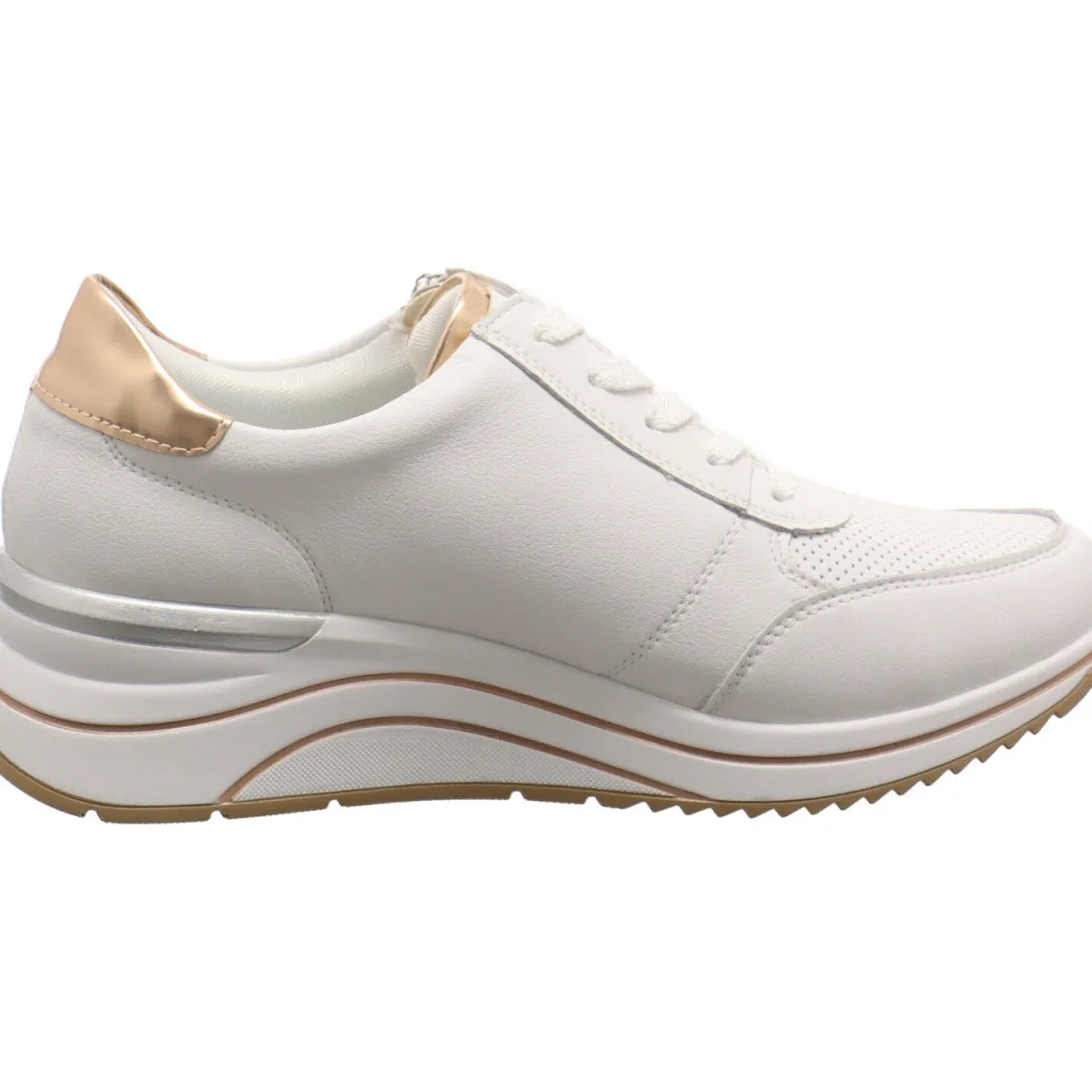 Das Obermaterial aus Leder in Weiß, ist auf dem Blatt mit einer Perforierung versehen. Tolle Details an der Ferse sowie am Schaft sind die Einsätze in einem Rose Gold, die Ziernähte und das Remonte Markenlogo an der Seite des Schuhs.