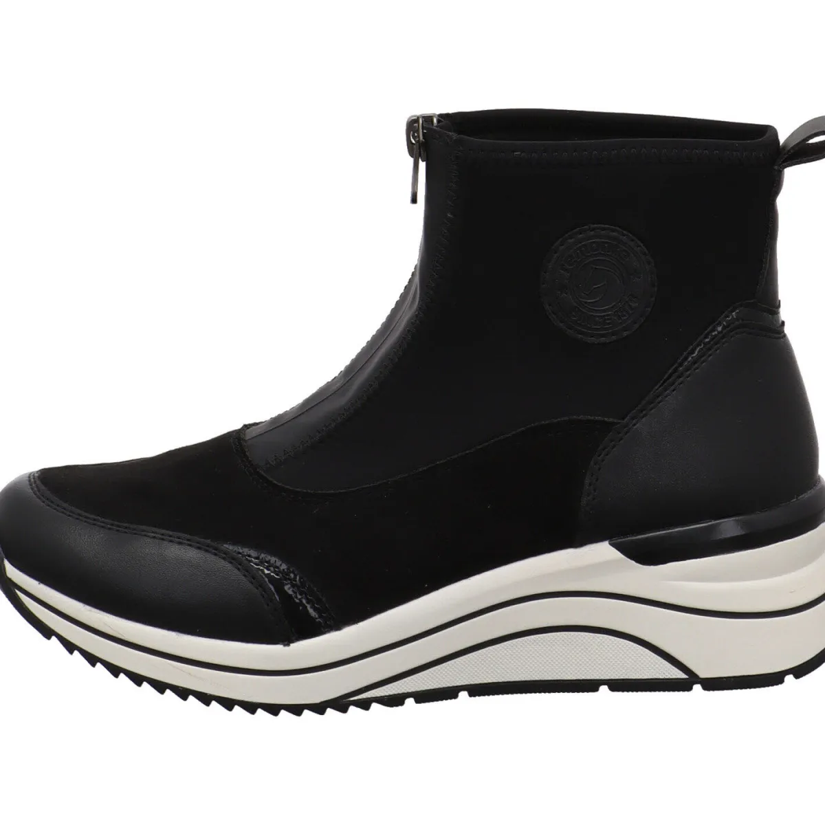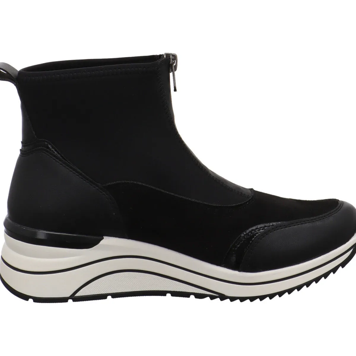 Sie wurde aus einem gekonnten Mix aus Textil und Synthetik in Schwarz gefertigt. Dabei fallen einem die verschieden Haptiken sofort ins Auge. So wurde an Ferse und Schuhspitze ein Kunstleder Einsatz verarbeitet. Der Schaft ist mit einem Stretch Material versehen. In Verbindung mit dem Reißverschluss auf dem Rist und der Lasche, ist der Einstieg ganz einfach. Die Remonte Soft Innensohle ist weich und als Wechselfußbett gearbeitet. So können auch eigene Einlagen verwendet werden.