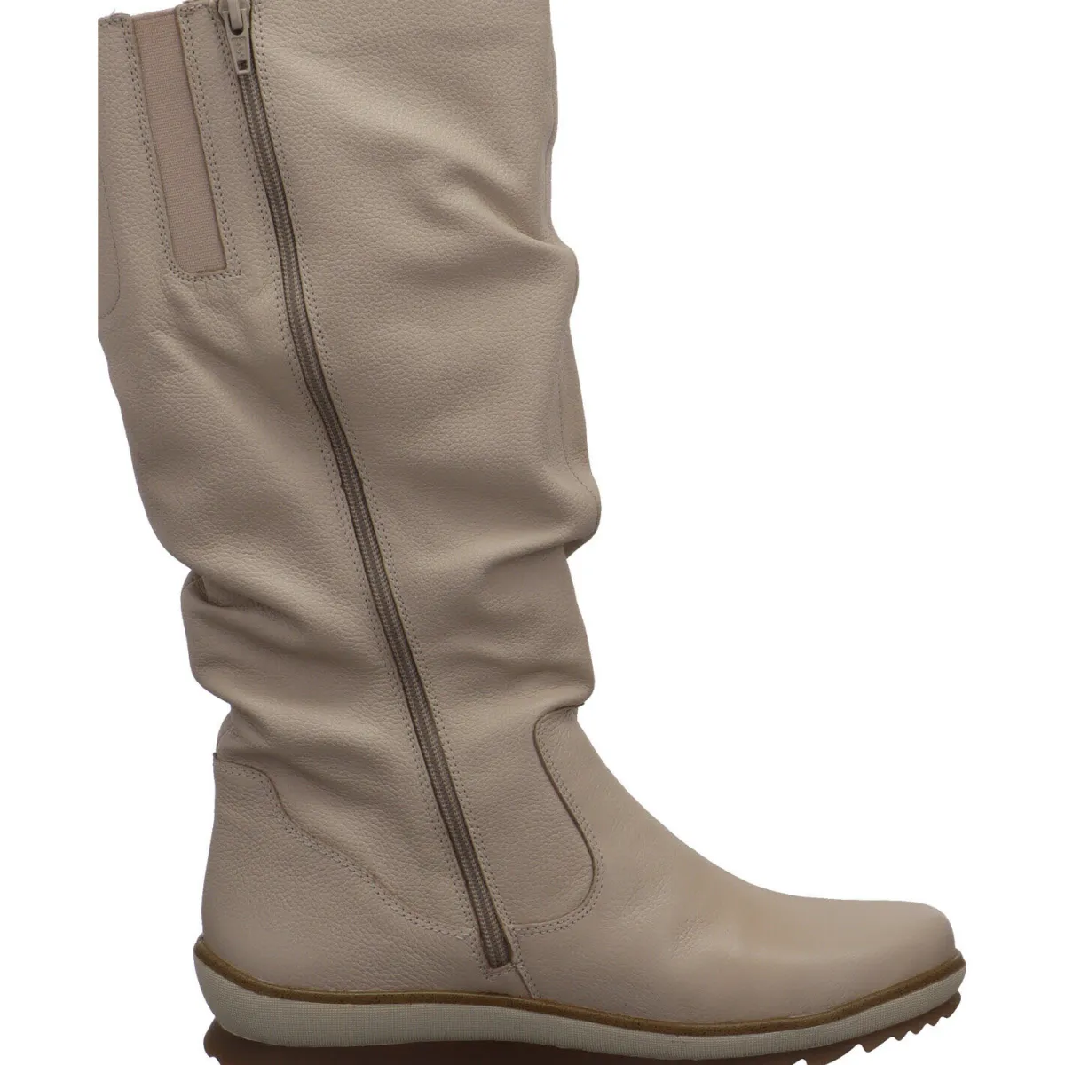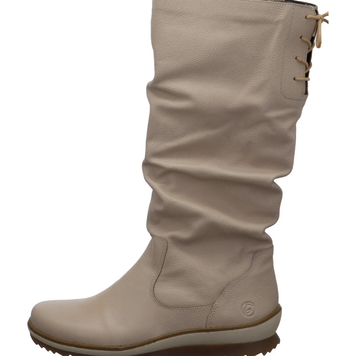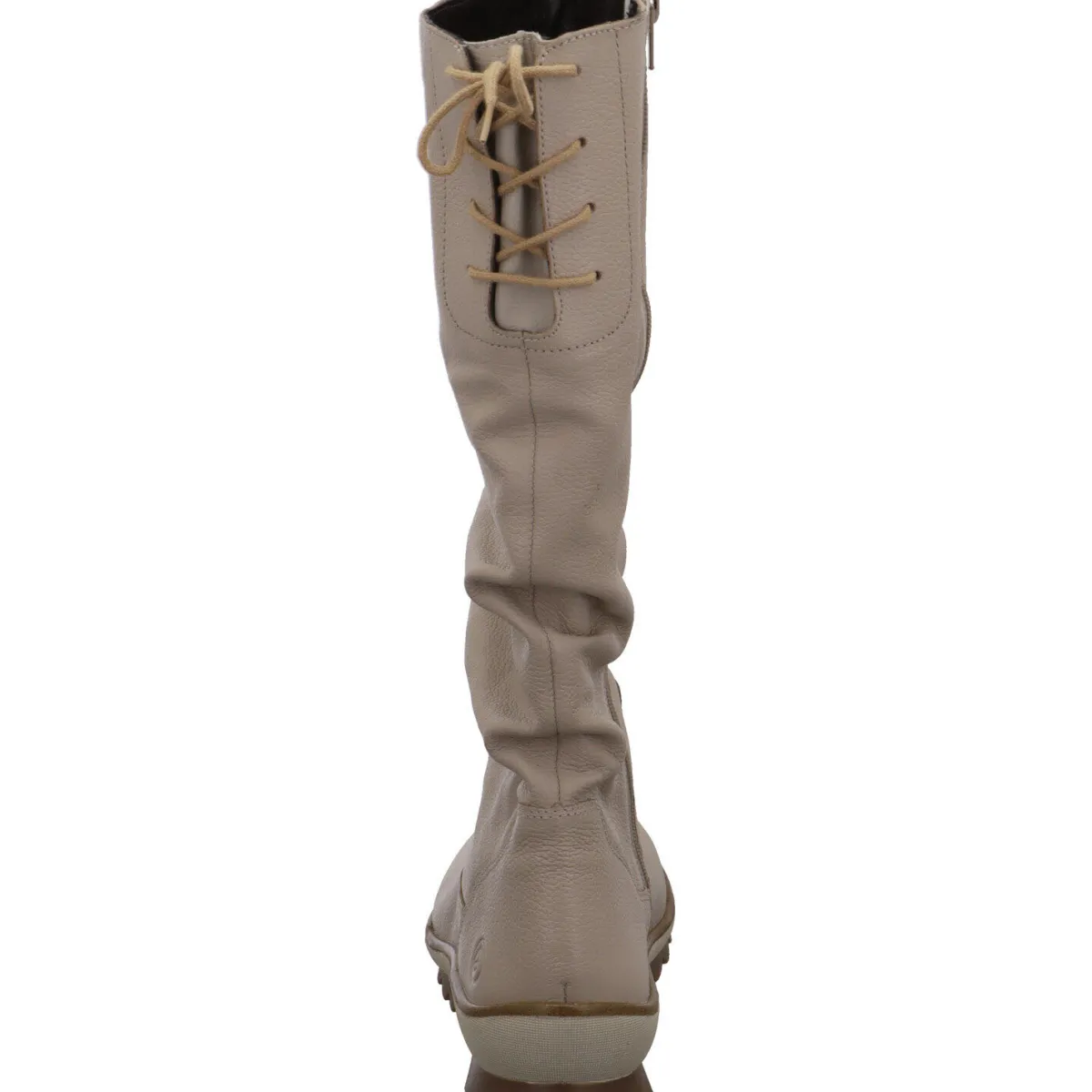 Er wurde aus hochwertigem Echtleder in Beige gefertigt. Der Schaft ist dabei stilvoll in Falten gelegt und an der Rückseite mit einer kleinen Zierschnürung versehen. Ein kleiner Dehngummi an der Seite sorgt für zusätzlichen Komfort.