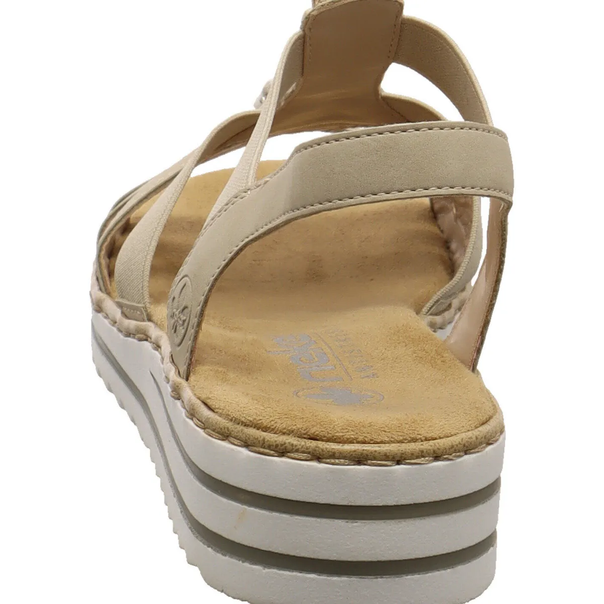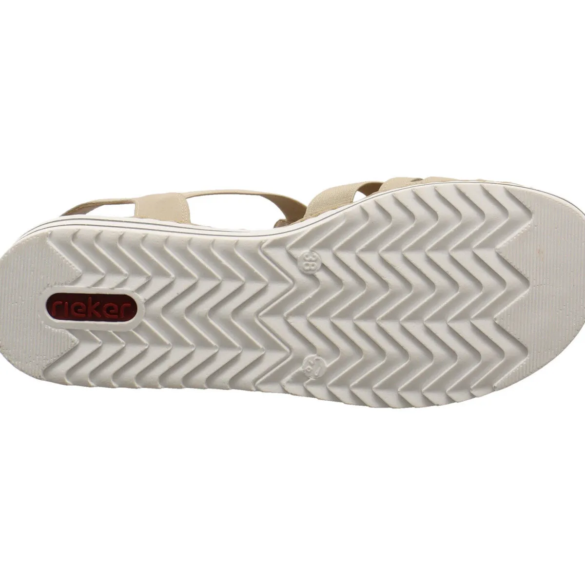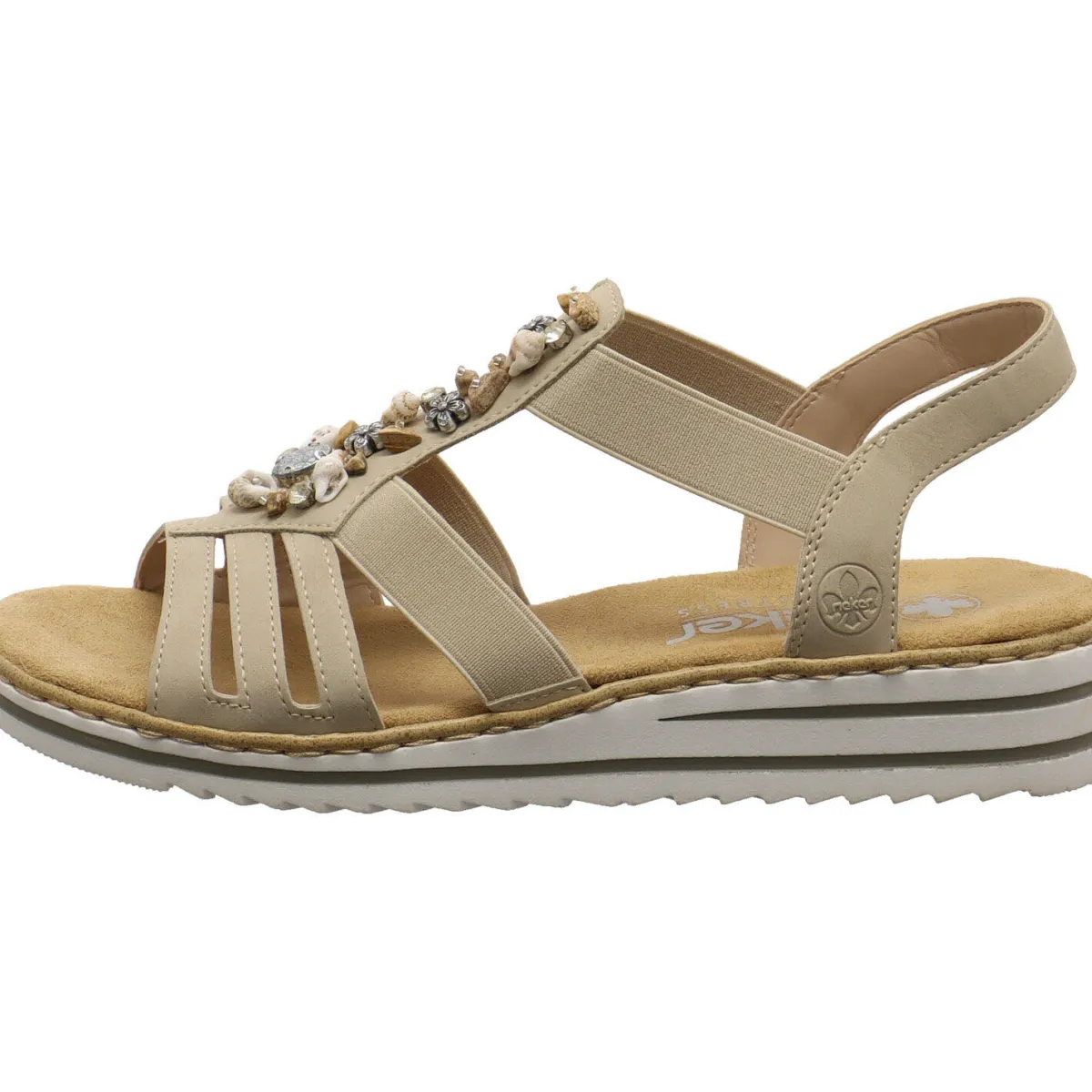 Die stillvoll gesetzten Riemen in Beige sind aus einem Mix aus Kunstleder und Textil gearbeitet. Einige davon sind als Dehngummi gearbeitet und sorgen dafür das der Einstieg ganz einfach ist. Besonderes Highlight ist hier die Applikation auf dem Rist mit kleinen Muscheln und Steinen. Diese erinnern sofort an Sommer, Sonne, Strand und Meer und machen jedes Outfit zu etwas besonderem.