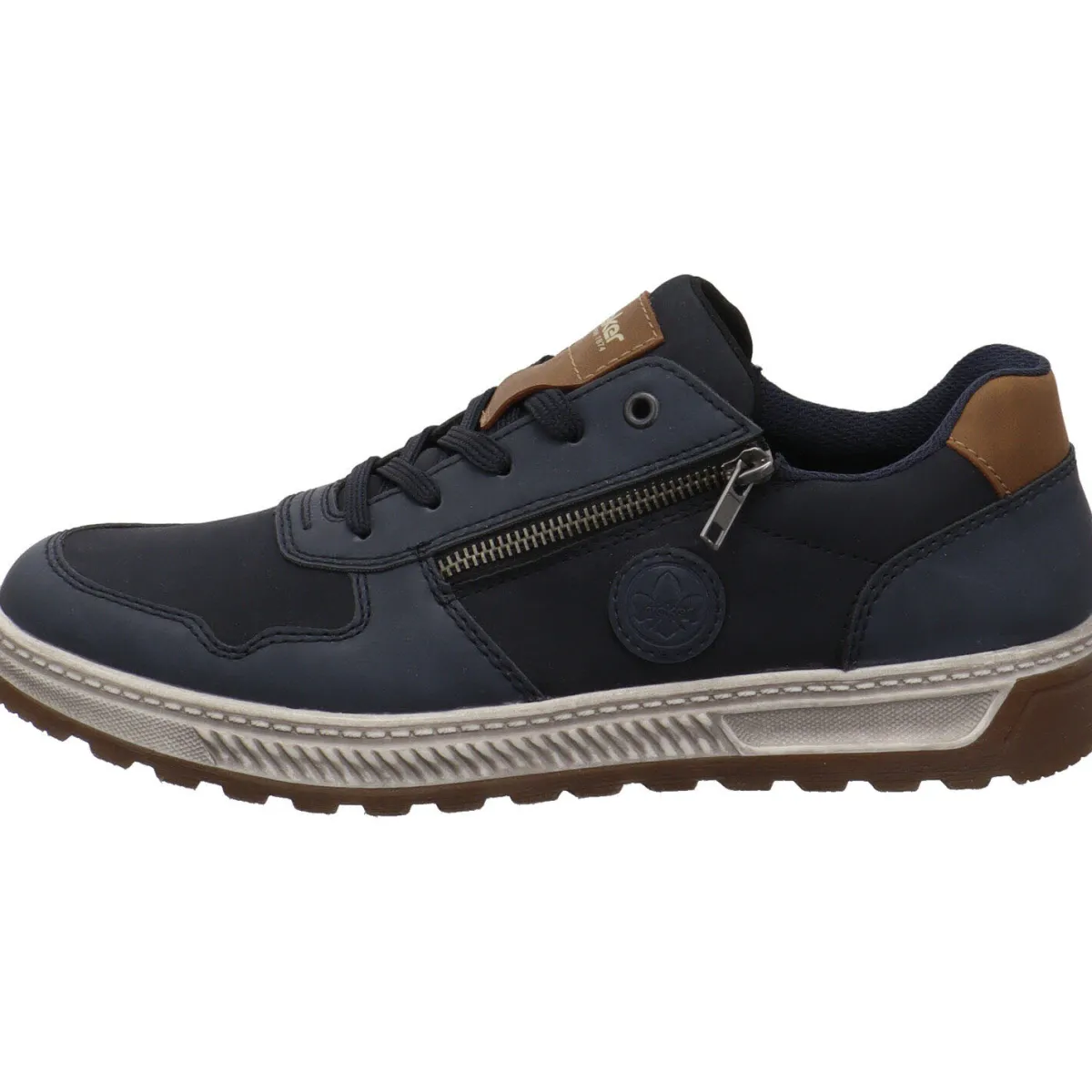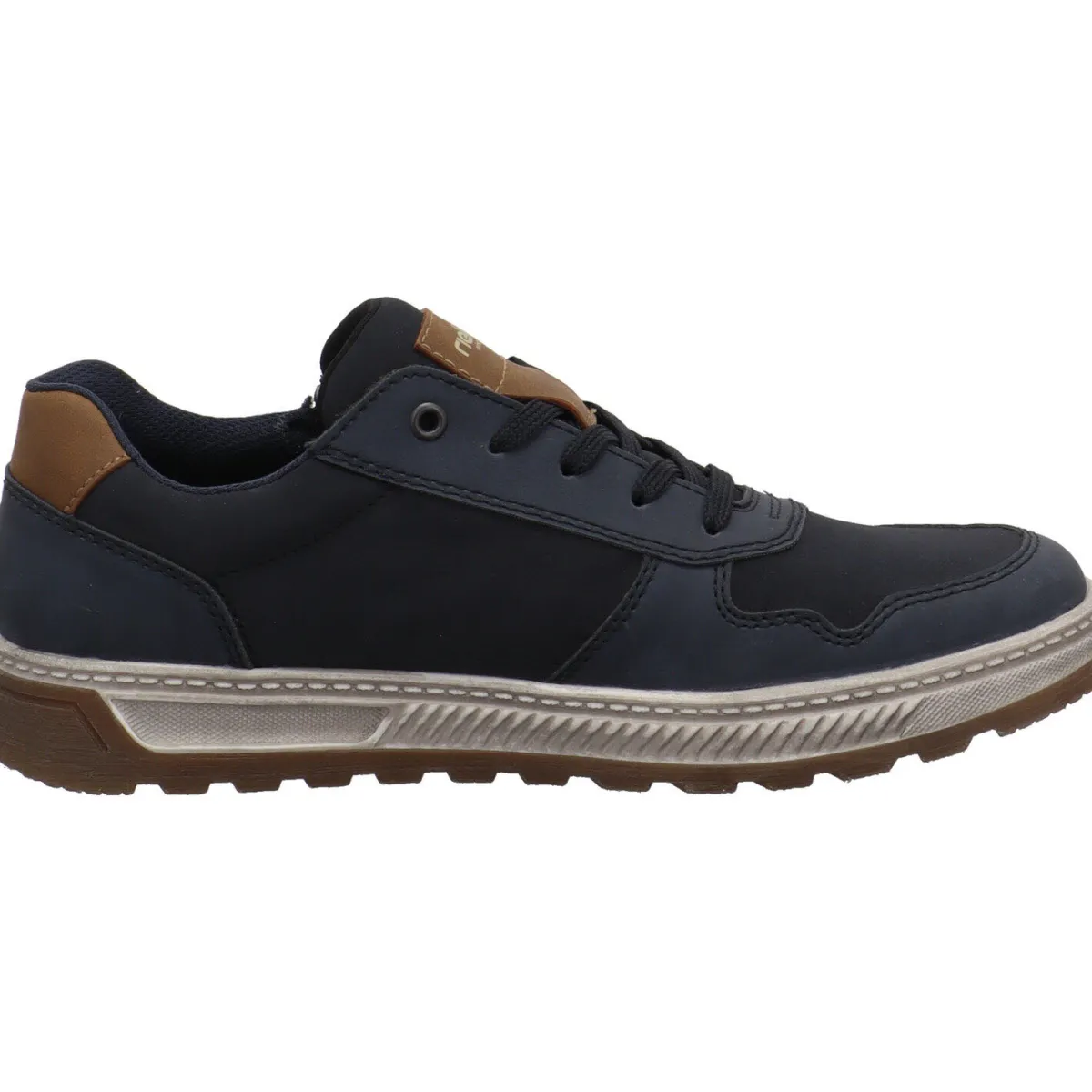 Dieses Modell wurde aus Kunstleder in Blau gefertigt. Seinen sportlichen Look erhält er durch die Akzente in Braun und die markante Laufsohle in Grau.