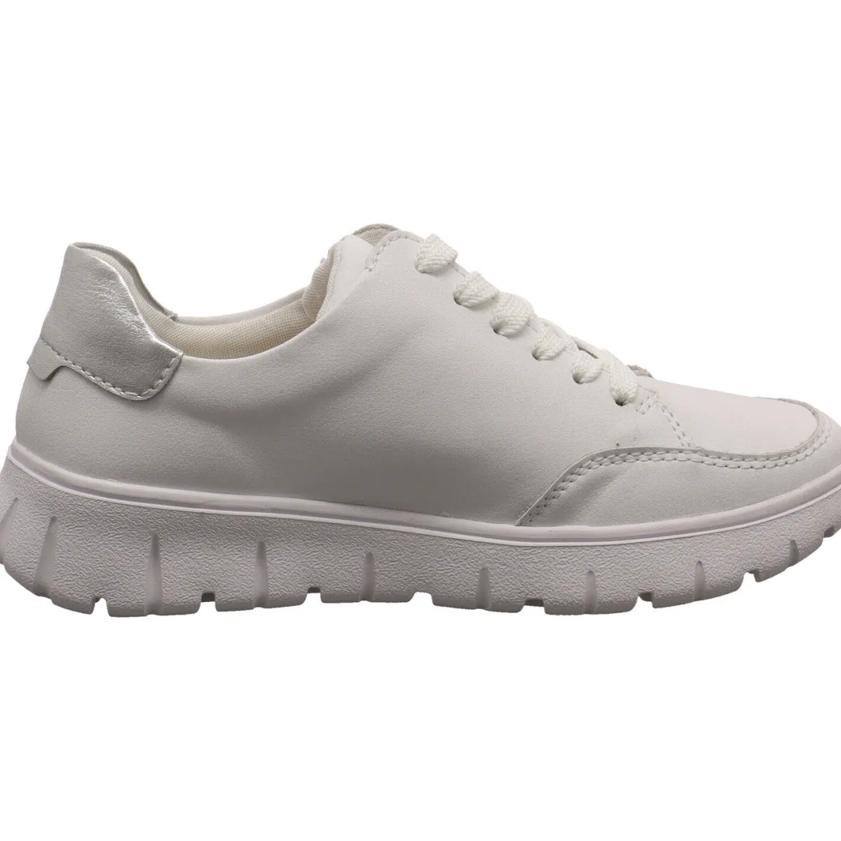 Das beschichtete Leder in Weiß ist an den Seiten mit einer bunten Ziernaht gearbeitet. Ein weiterer Hingucker ist der Einsatz an der Rückseite vom Schaft in Silber.