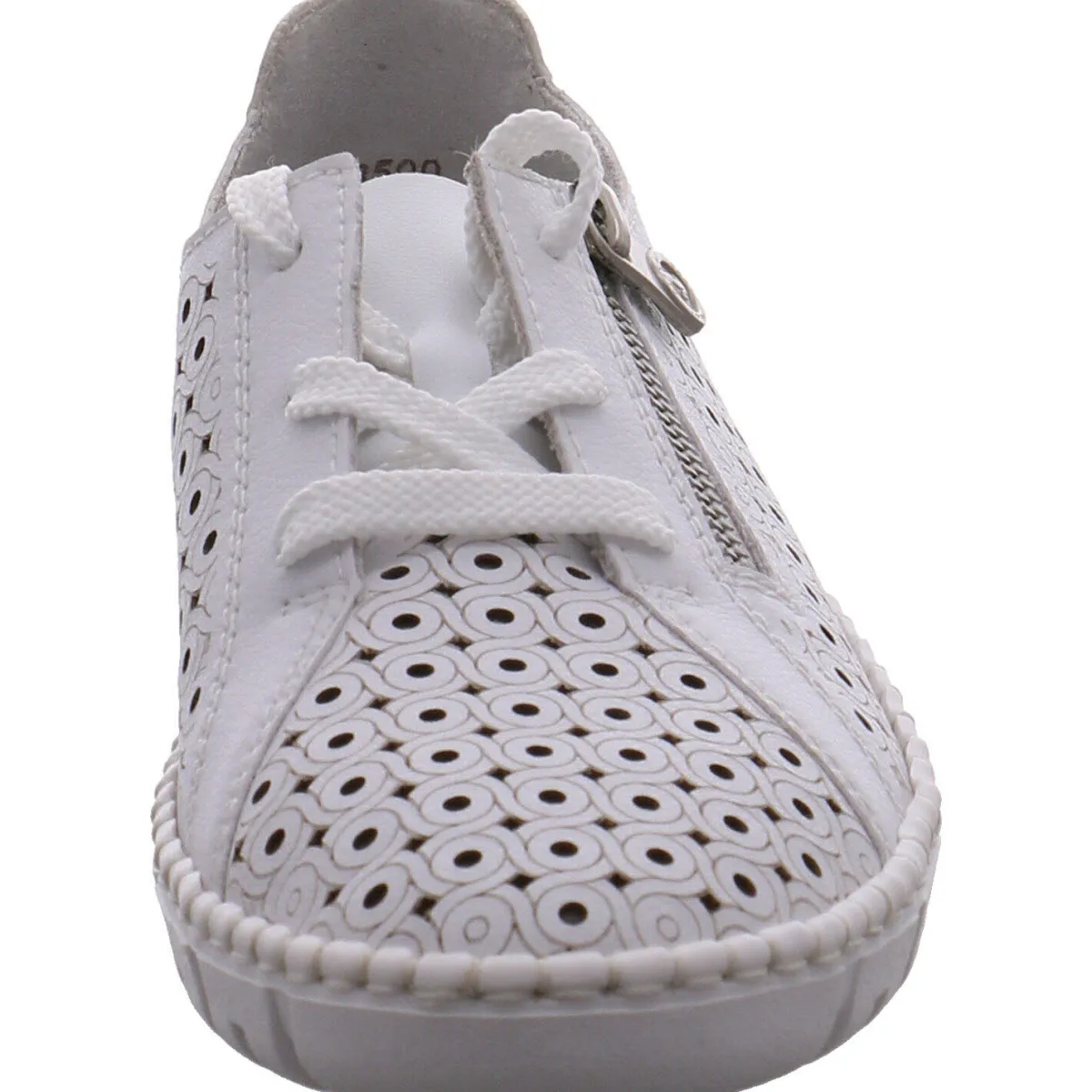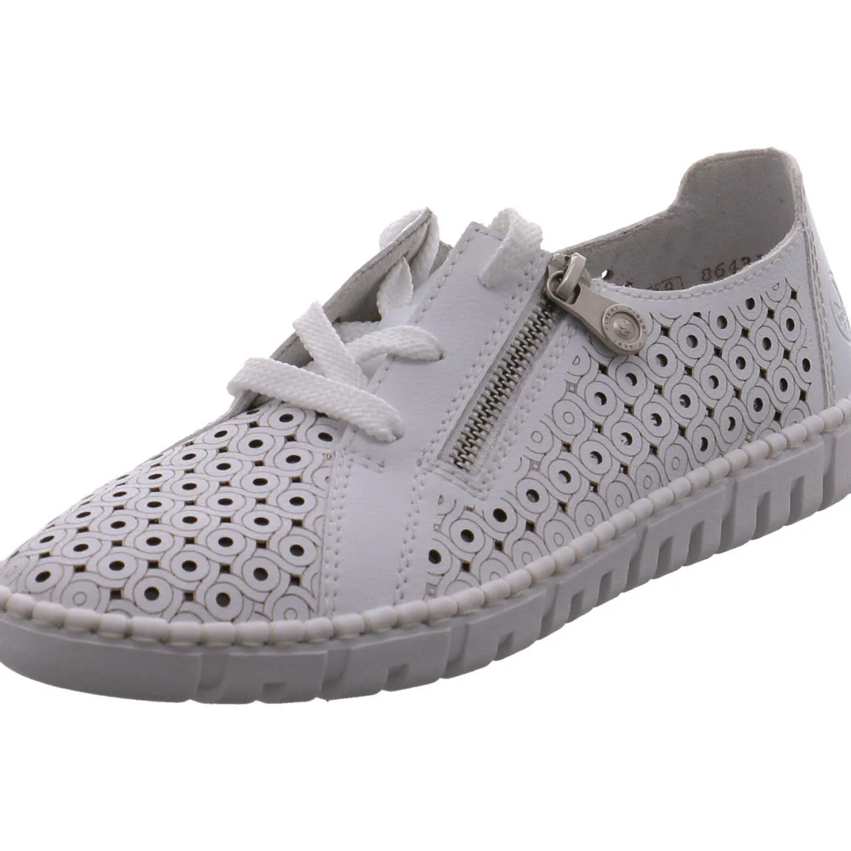 Gefertigt aus Echtleder in Weiß und mit einem Print versehen wurde der Schuh mit einer Allover Lochprägung ausgestattet, die zudem für ein angenehmes Fußklima sorgt.
