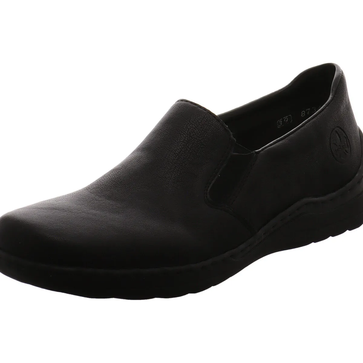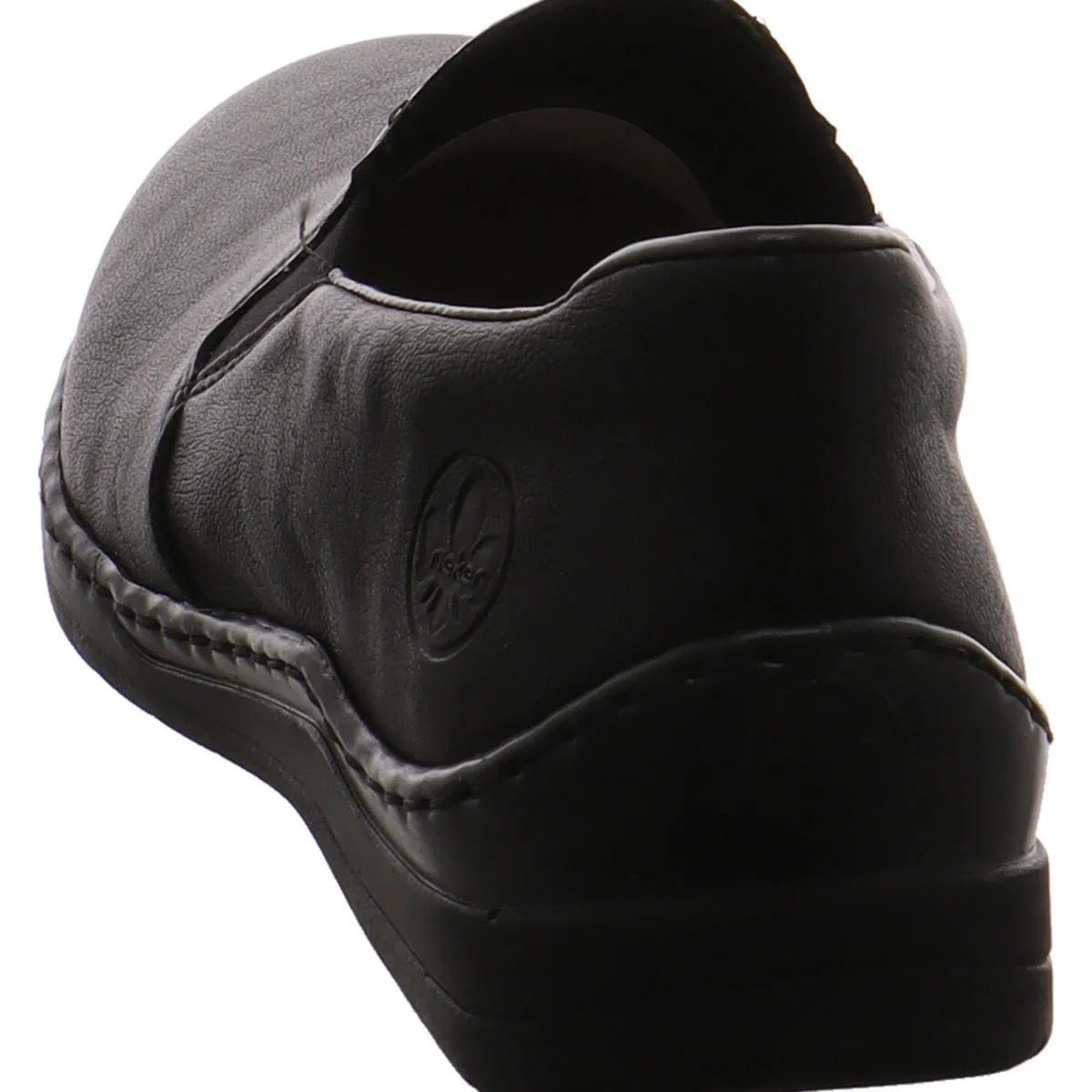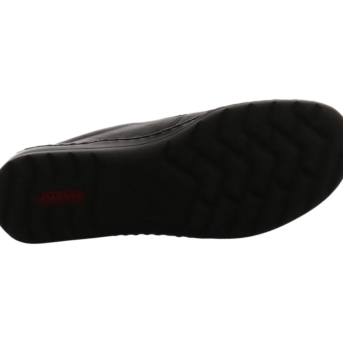 Das Obermaterial aus Kunstleder in Schwarz mit dem Rieker Markenzeichen an der Seite macht den Schuh schlicht und gut kombinierbar.