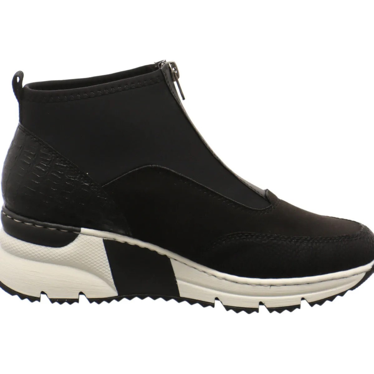Das Obermaterial besteht aus einem gekonnten Mix aus Kunstleder und Textil und begeistert durch seine verschiedenen Haptiken und die gelungende Farbkombination von Schwarz mit Weiß.