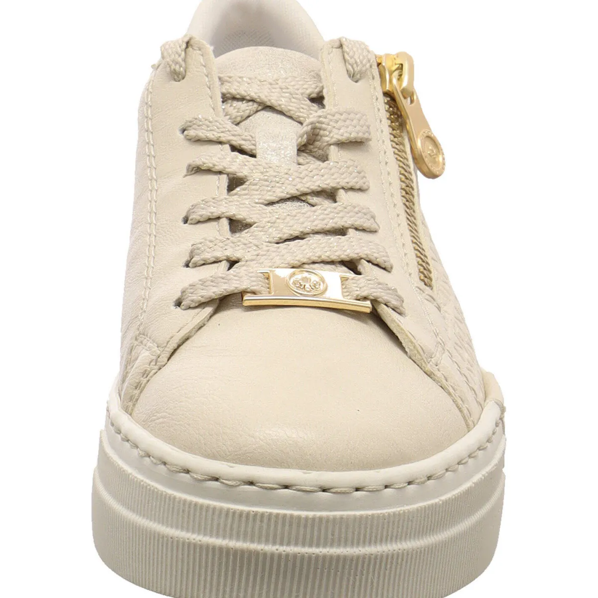 Das Obermaterial aus Kunstleder in Beige ist schlicht, aber dennoch durch die Plateausohle ein Hingucker. Er ist an der Seite mit einr tollen Prägung versehen und an der Ferse findest du einen Metallic Schimmer Einsatz. Durch die Schnürung mit Glizer Faden kann der Sneaker optimal an den Fuß angepasst werden und der seitliche Reißverschluss in Gold, hilft bei einem leichten Einstieg. Auch hier findest du die tolle Antistress Innensohle, die besonders weich und komfortabel ist. Die Gummilaufsohle ist zudem rutschhemmend und bietet einen tollen Laufkomfort.