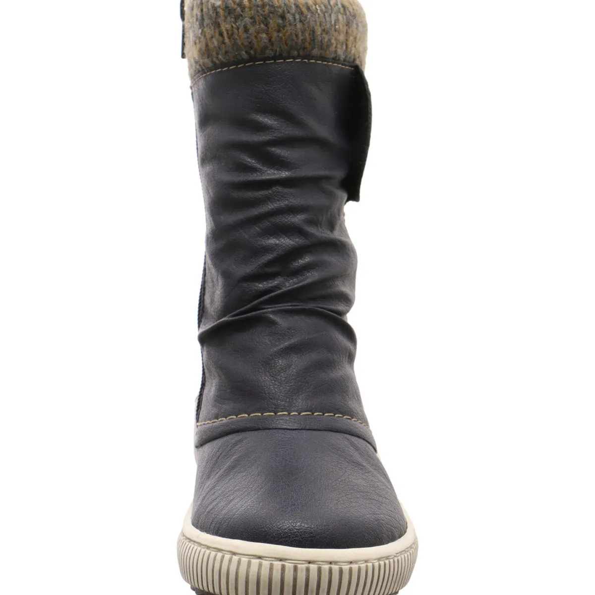 Gefertigt aus einem Mix aus Kunstleder und Textil in Blau, ist der Schaft mit Wolle im Strick Look versehen. Das umgeknickte Obermatrial am Schaft, in Rot gestaltet, sowie das zusammengeraffte Obermaterial und die farblichen Ziernähte sind zusätzliche Eyecatcher.