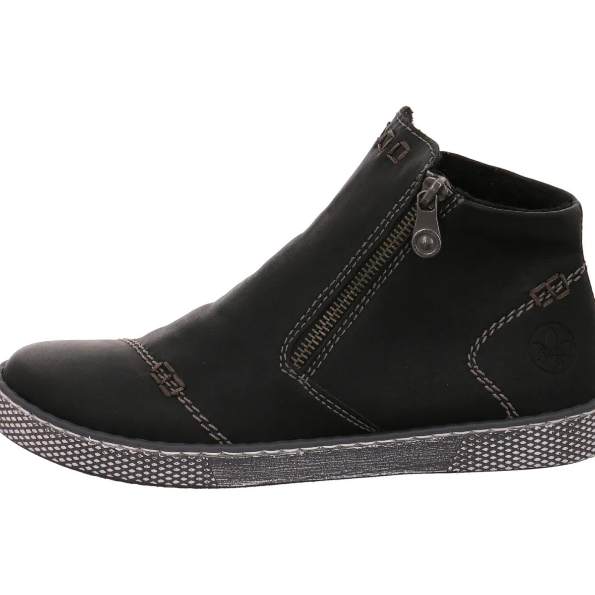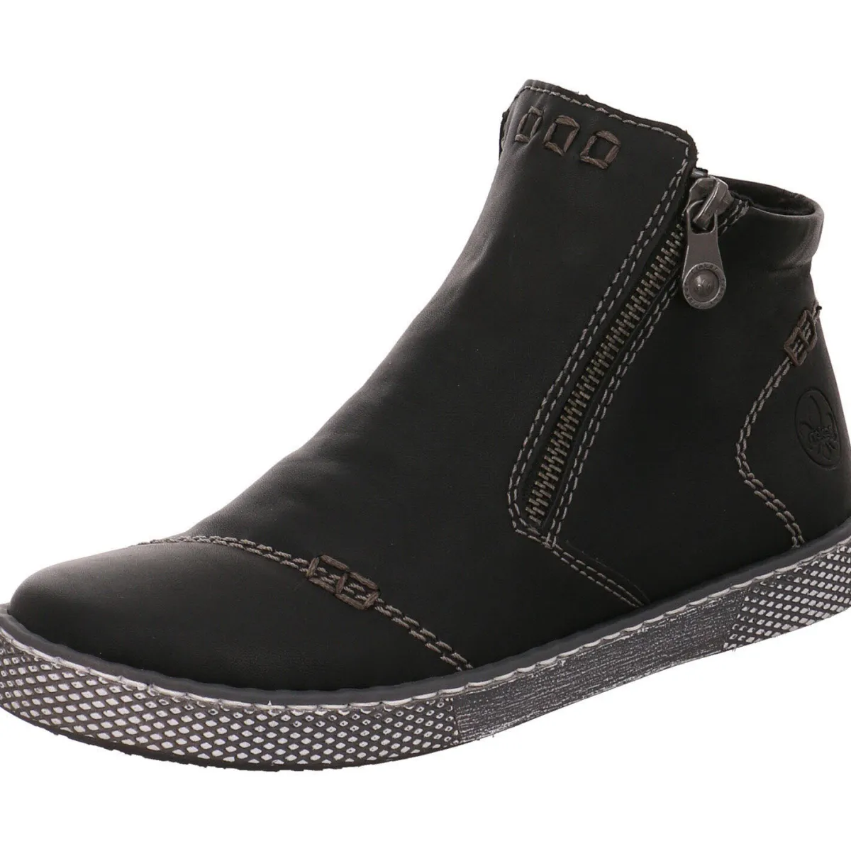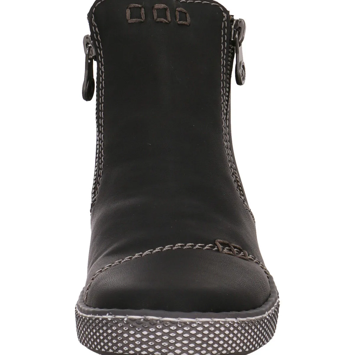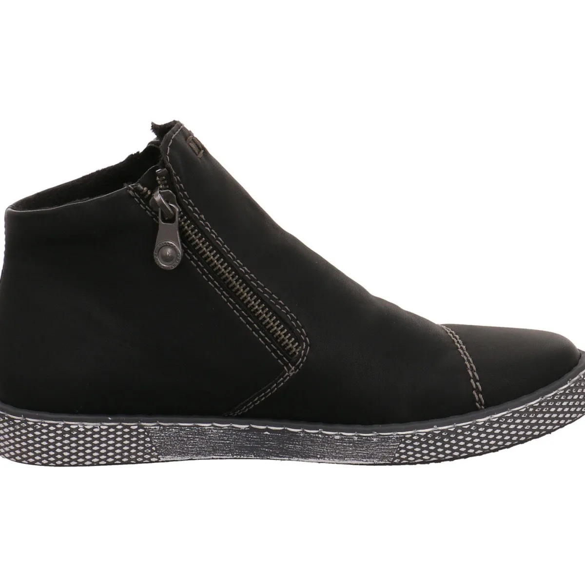Sie wurde aus authentisch genarbtem Kunstleder in Schwarz gefertigt. Kräftige Ziernähte und die hell abgesetzte Laufsohle passen zum modernen Look dieser Stiefelette. Der doppelte Reißverschluss hilft bei einem leichten Ein- und Ausstieg. Das Warmfutter hält Ihre Füße auch an kälteren Tagen angenehm warm. Die weiche Antistress Innensohle macht das Tragen besonders angenehm und ist gleichzeitig ein Wechselfußbett, wodurch das Tragen loser Einlagen jederzeit möglich ist.