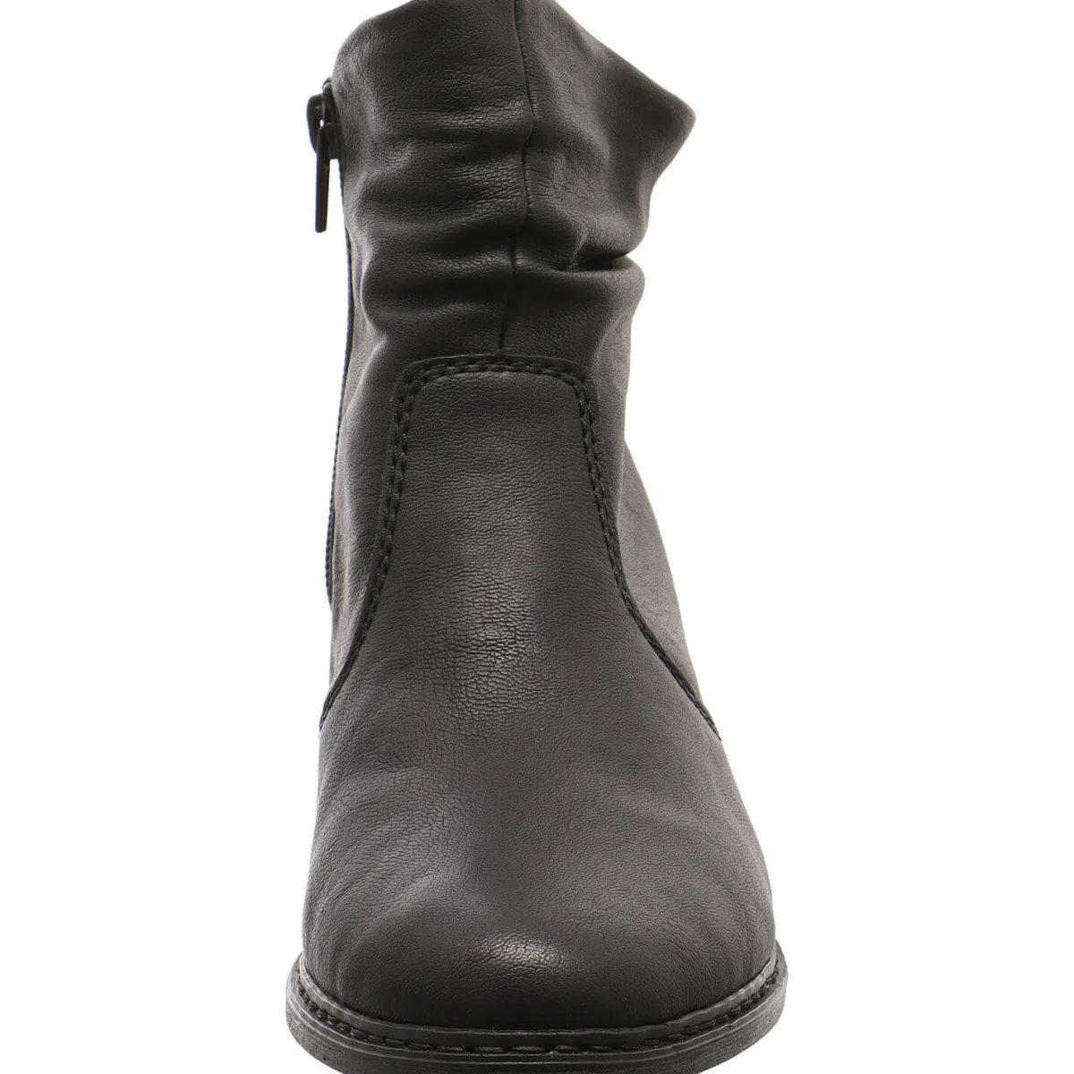 Das Obermaterial aus Kunstleder in Schwarz ist am chaft stilvoll in Falten gelegt. Die Schnittführung des Schuhs, erinnert an einen Cowboystiefel, wodurch er einen modischen Touch erhält.