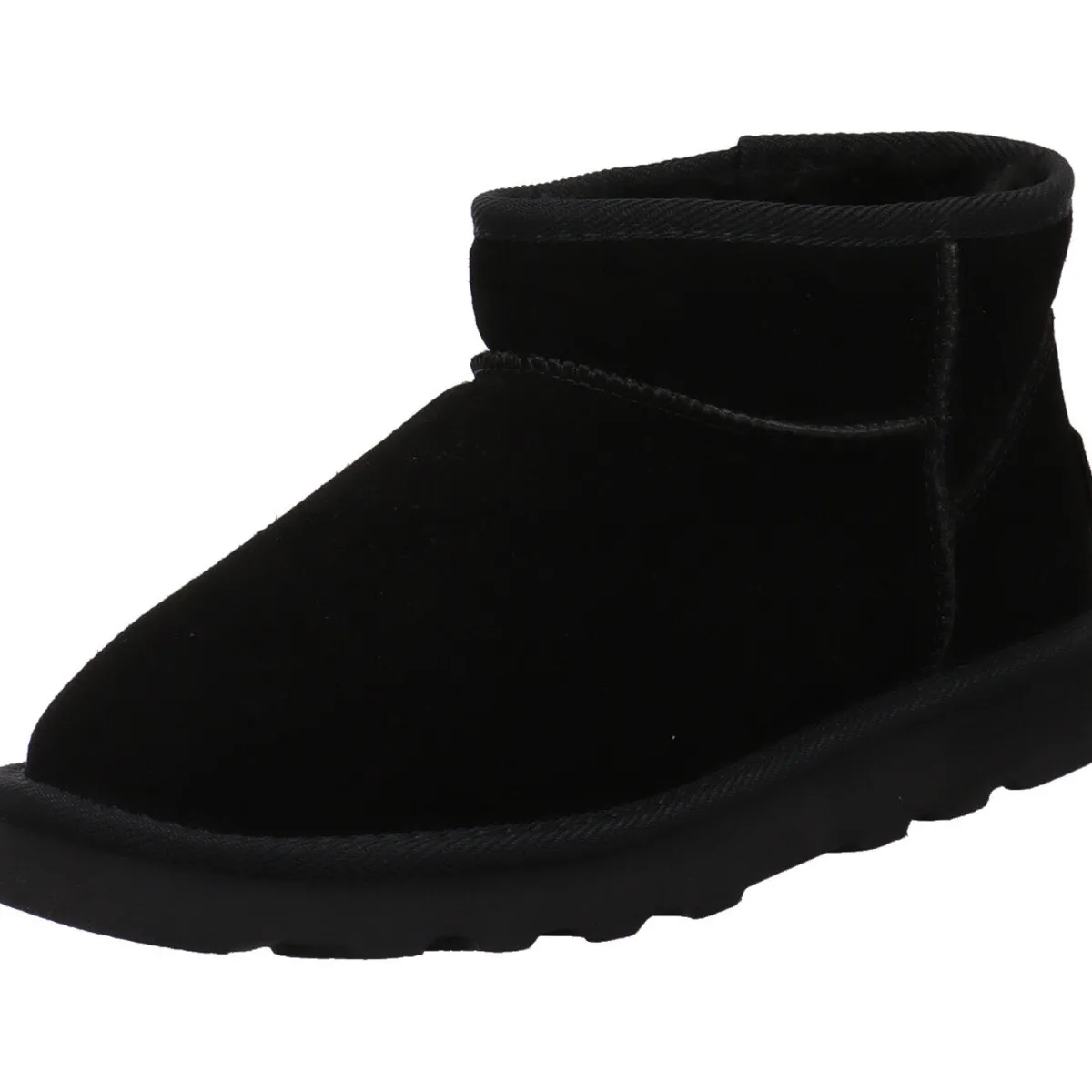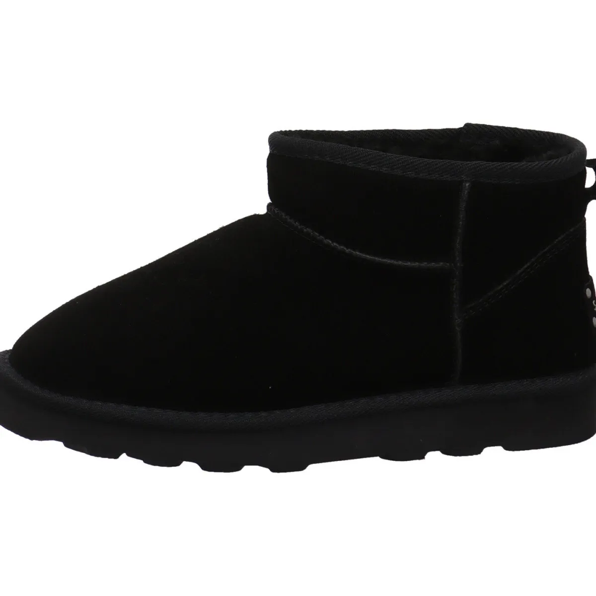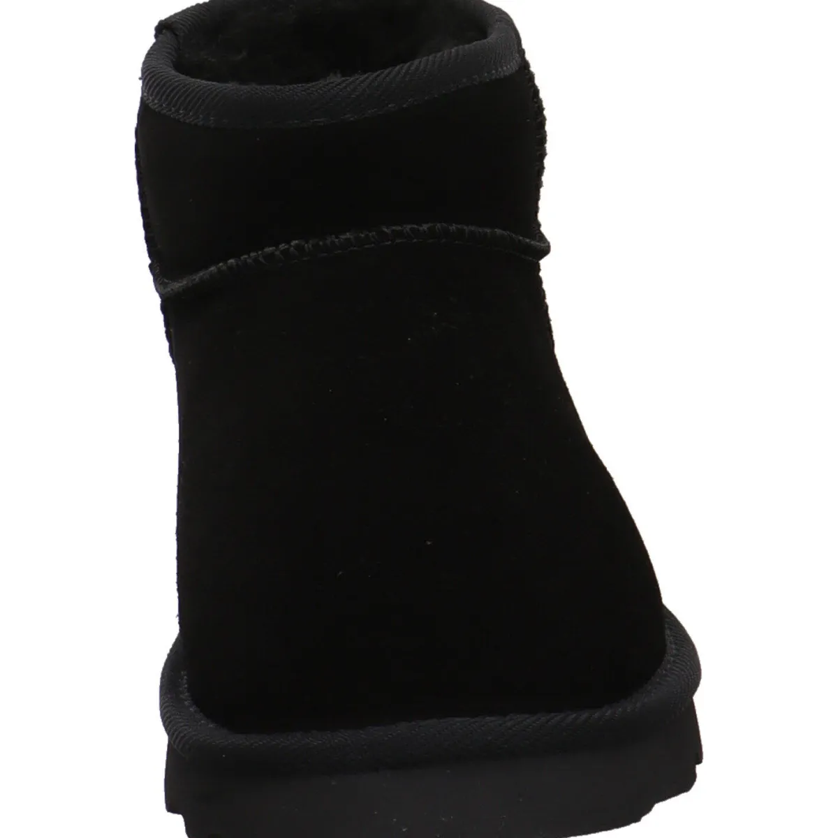 Er wurde aus Nubukleder in Schwarz gearbeitet und begeistert durch seine lässige Form. Der Schaft ist mit einem Textilband versehen und das flauschige Innenfutter ist zu erkennen. Er kommt mit einem Rock oder schmalen Hose besonders gut zur Geltung. Das Innenfutter ist aus Plüsch und besonders weich und flauschig. Durch den weiten Schaft und der Textillasche ist der Einstieg ganz einfach.