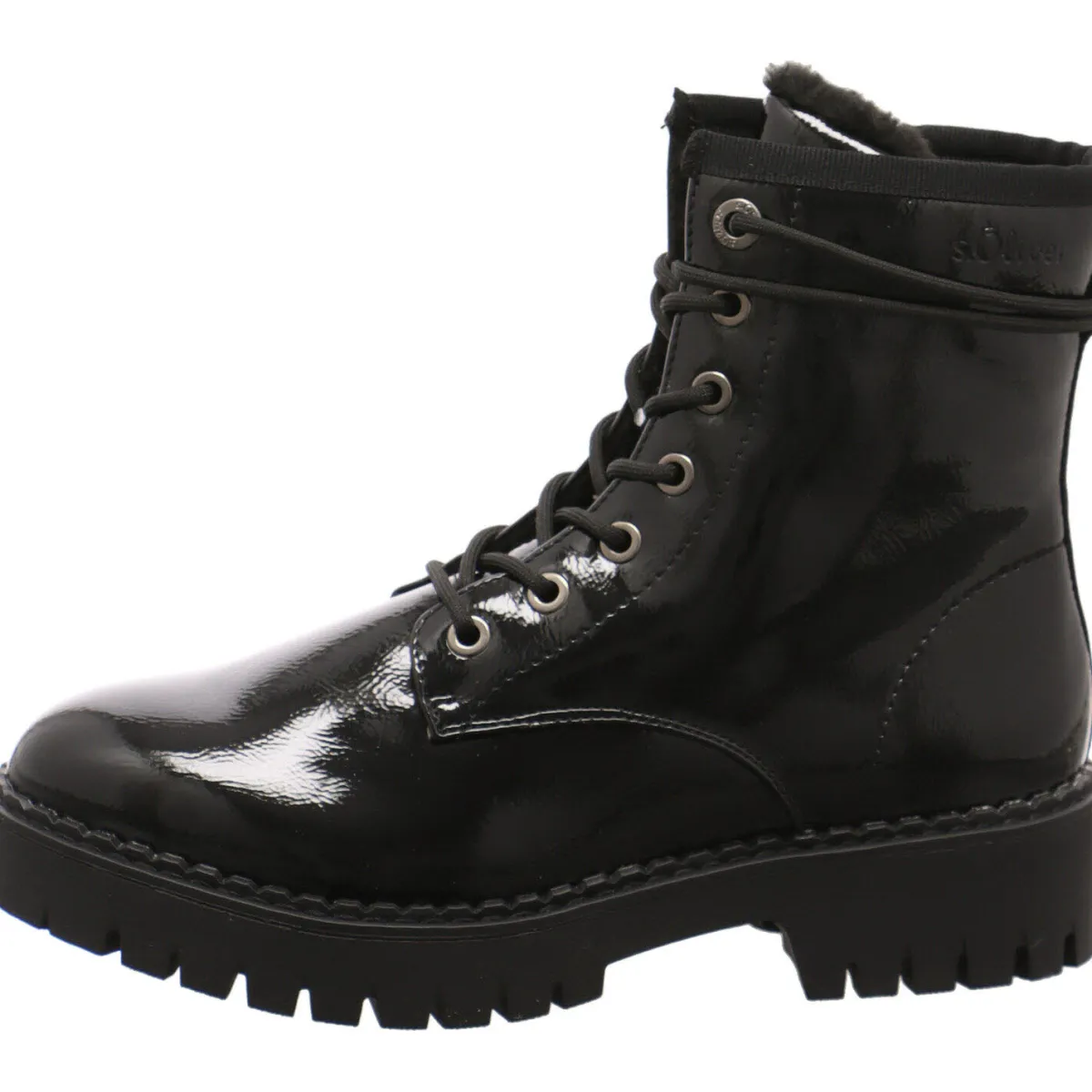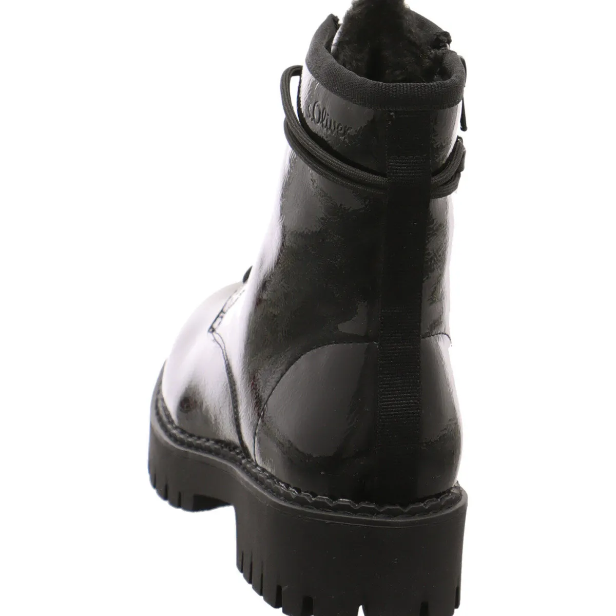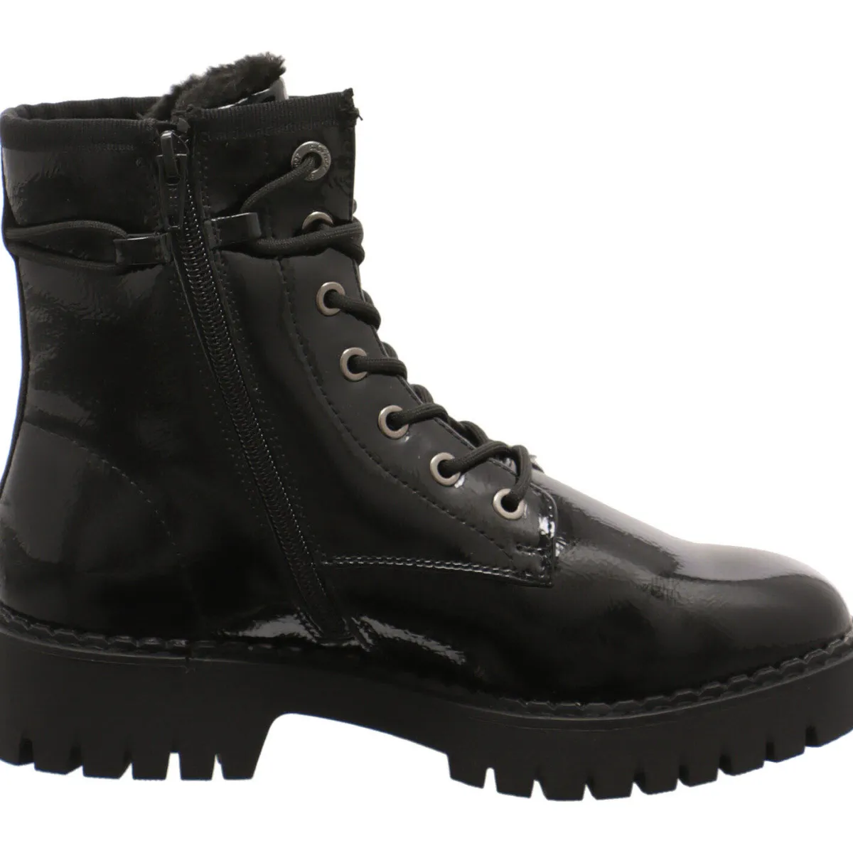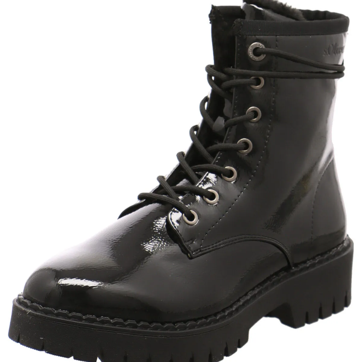 Das Obermaterial aus Kunstleder in Schwarz Lack ist am Schaft mit der Markenaufschrift versehen, die als Hingucker dient.