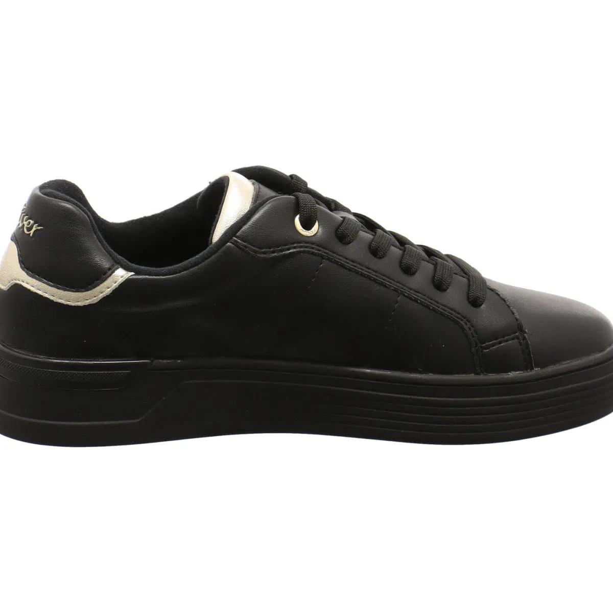 Das Obermaterial besteht aus pflegeleichtem Kunstleder in Schwarz. Farbakzente in Gold machen den Schuh zu einem tollen Hingucker. Der Schaft ist angenehm gepolstert und mit der Schnürung kannst du die Passform optimieren. Die Innensohle ist angenehm gepolstert und als Wechselfußbett gearbeitet. Ein toller Sneaker im rundum gelungenen Design.