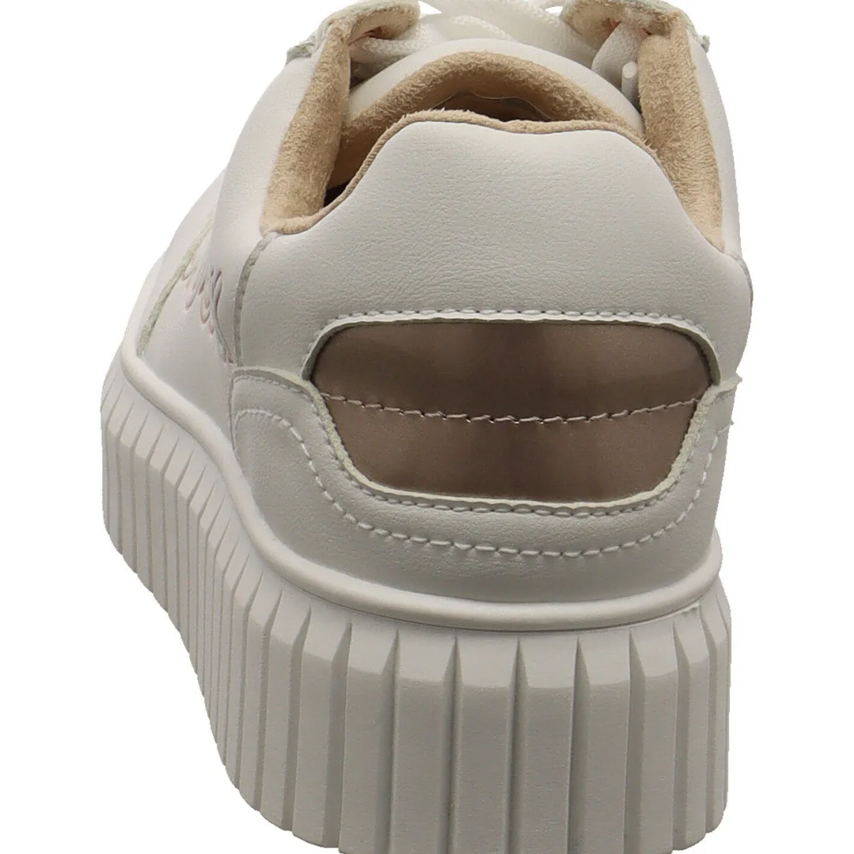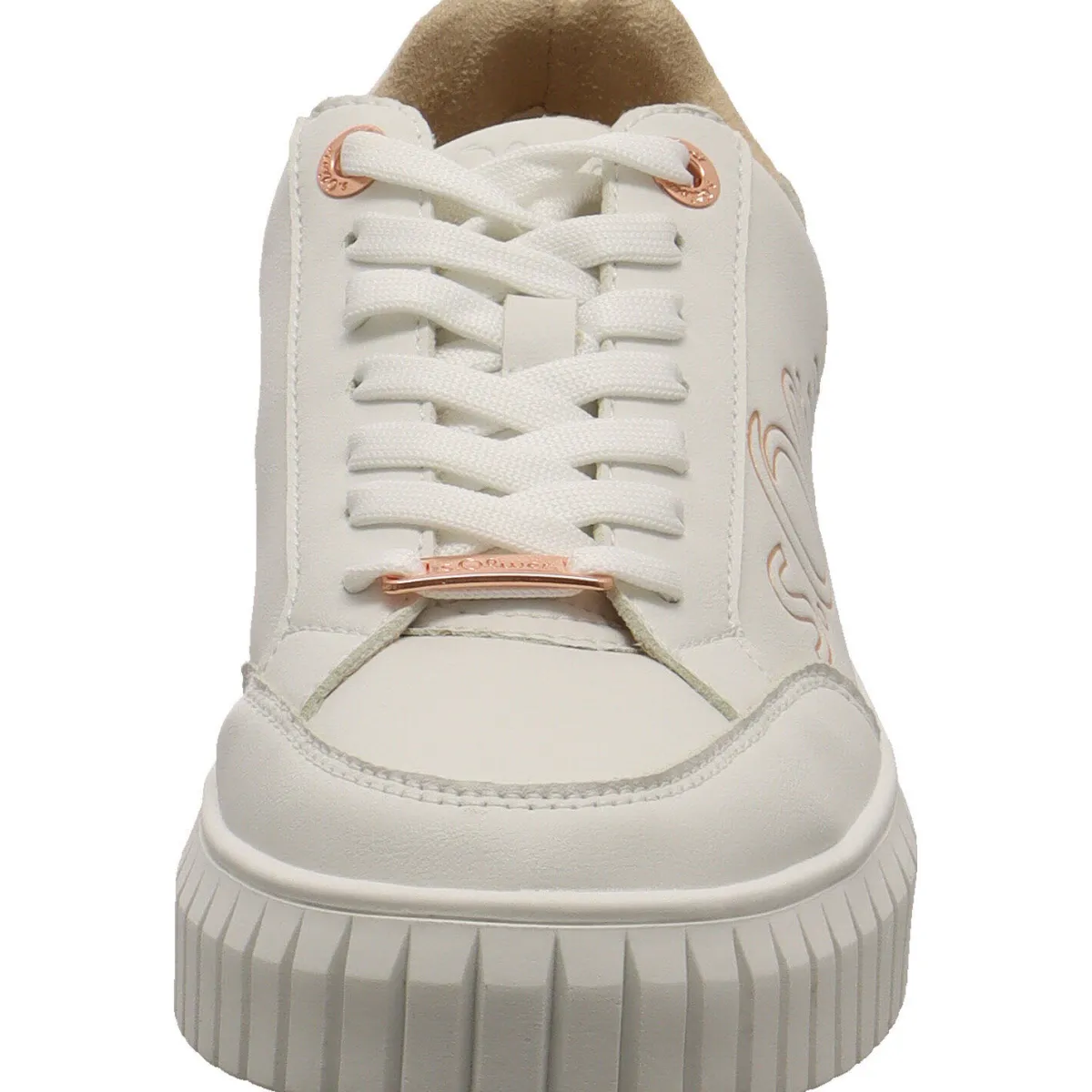 Er wurde aus Kunstleder in Weiß gefertigt. Das Marken Logo an der Seite und ein Einsatz an der Ferse in Rose Gold, verleien ihm den modischen Touch. Der Schaft ist angenehm weich gepolstert und mit der Schnürung kannst du ihn genau auf deine Bedürfnisse anpassen. Auch an den Ösen findest du das Rosegold wieder.