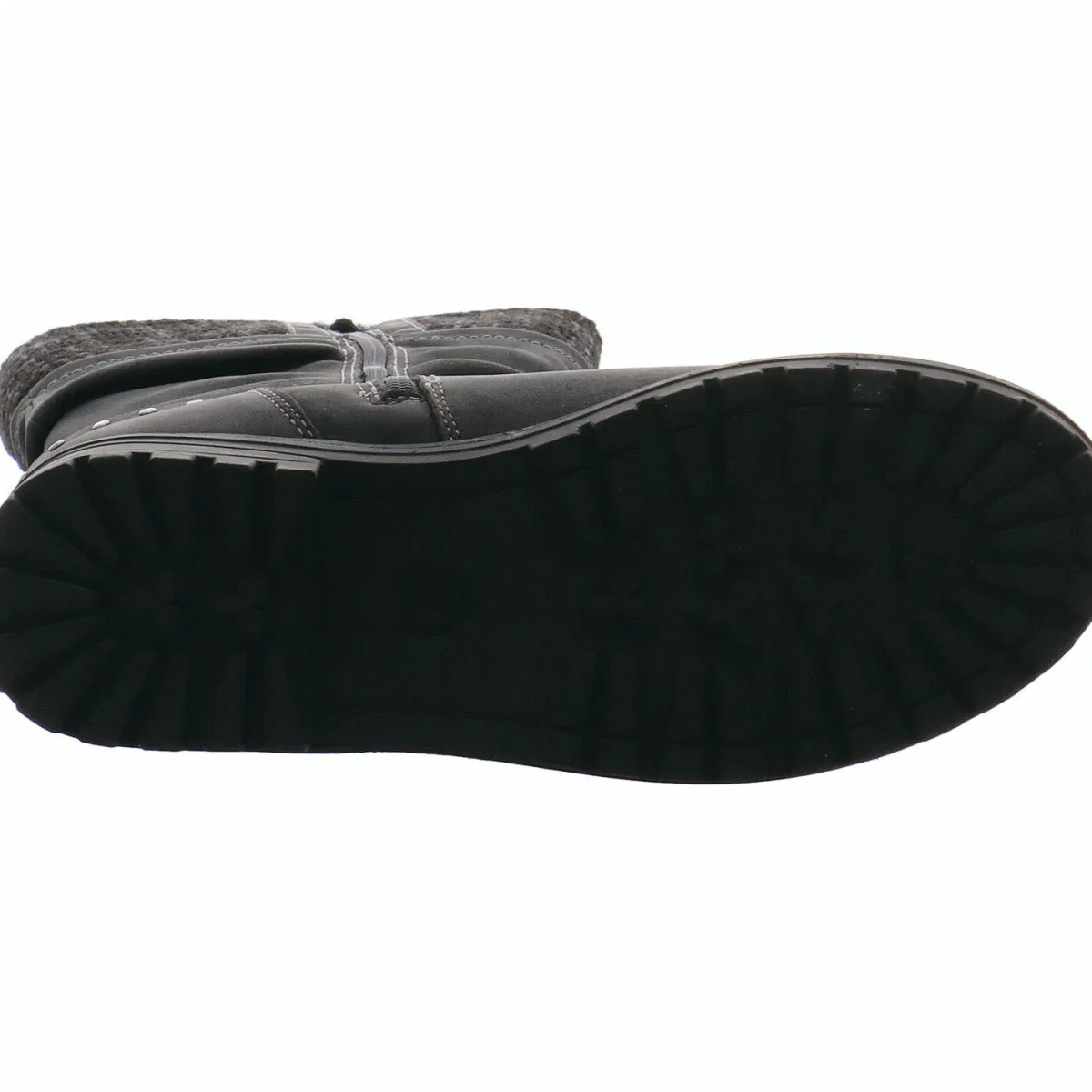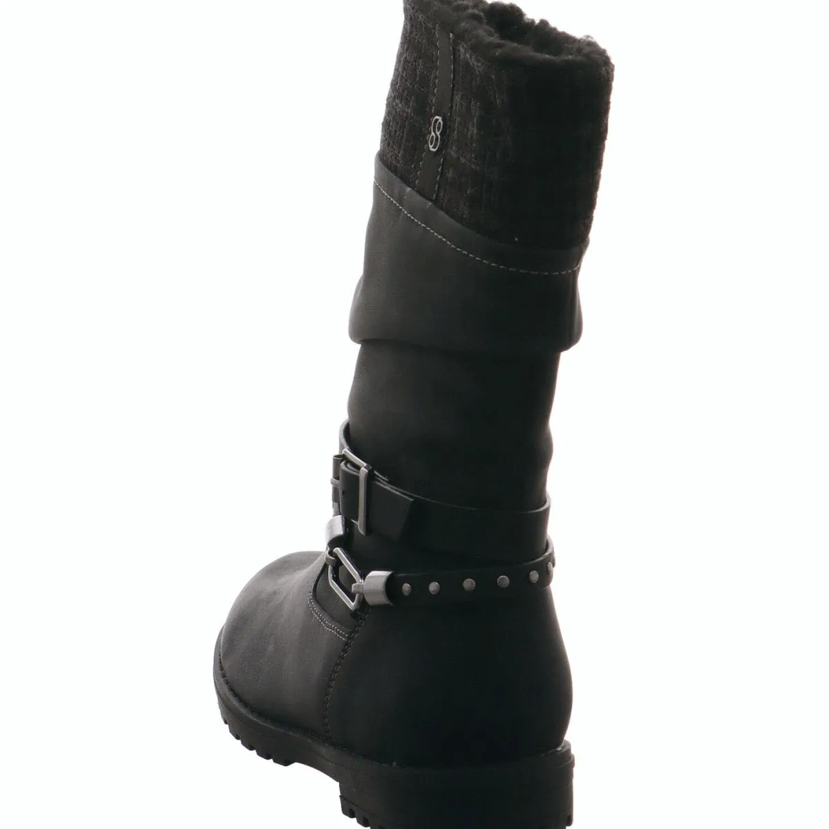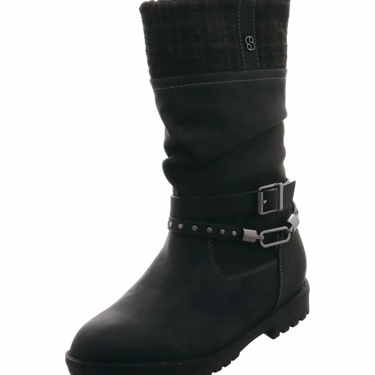 Gefertigt aus einem gekonnten Mix aus Kunstleder und Textil in Schwarz begeistert er durch den Strickbund am Schaft Schaft und den Plüsch Rand. Zierriemen um den Knöchel sind zusätzöiche Eyecatcher.