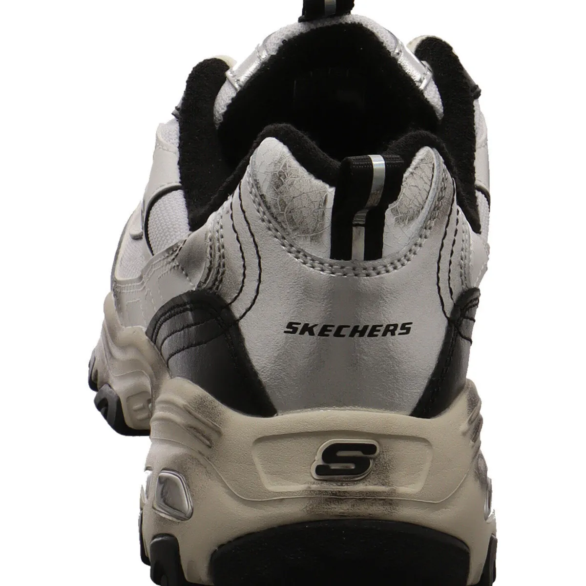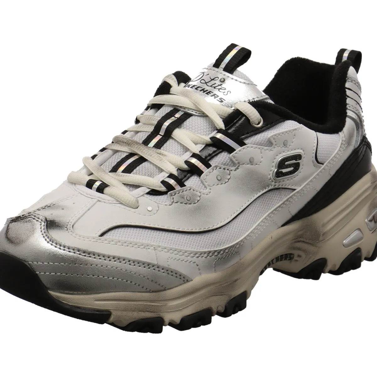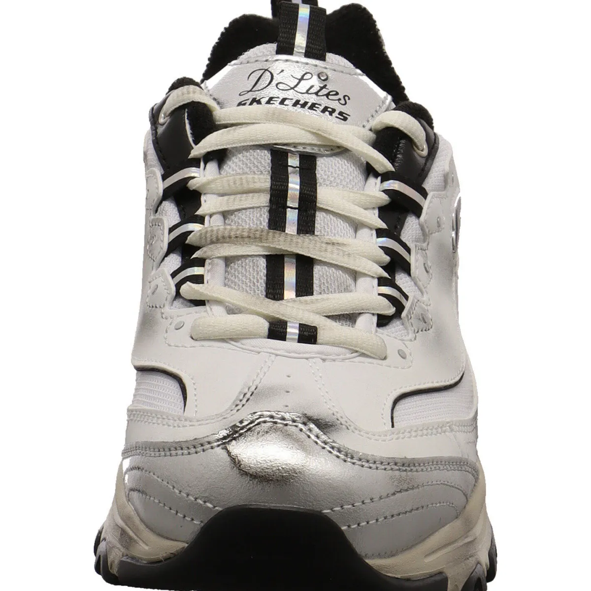 Das Obermaterial in Weiß wurde aus einem tollen Mix aus Echtleder und Synthetik gefertigt und mit Metallic schimmernden Einsätzen in Schwarz und Silber verziert. Durch die beiden Textil Laschen am Schaft ist der Einstieg ganz leicht und mit der Schnürung kann er optimal an den Fuß angepasst werden. Das Frottee Innenfutter bietet dir ein tolles Tragegefühl und dank der gepolsterten Skechers Air-Cooled Memory Foam Innensohle ist der Schuh super weich und passt sich perfekt deinem Fuß an.