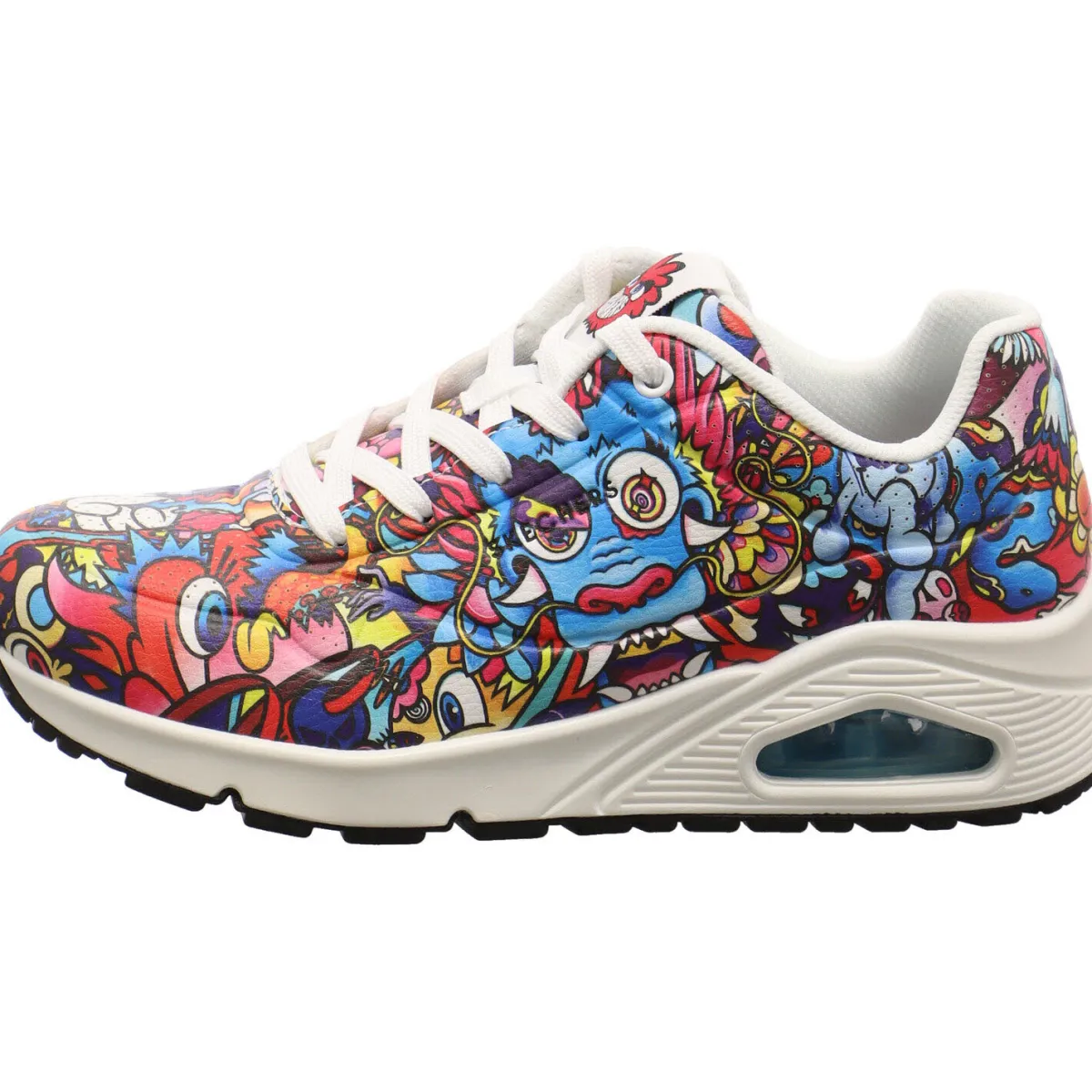 Der Sneaker verfügt über ein Obermaterial aus synthetischem Durabuck mit den charakteristischen „Doodles“ von Vexx, eine Skechers Air-Cooled Memory Foam Einlegesohle und eine sichtbare luftgepolsterte Skech-Air Zwischensohle. Der Schaft ist angenehm gepolstert und durch die Schnürung kann der Schuh perfekt an den Fuß angepasst werden.