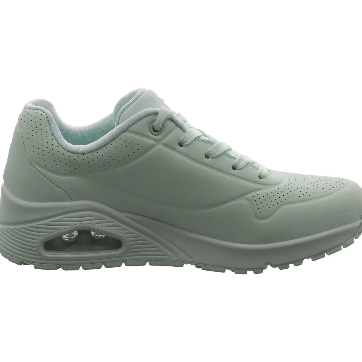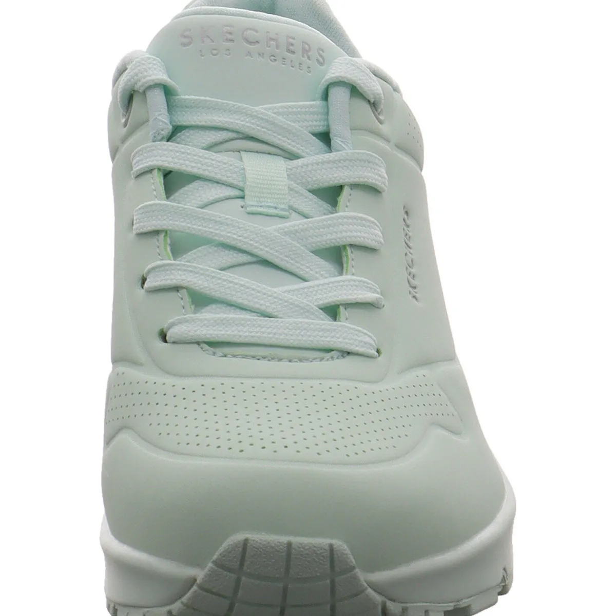 Das Obermaterial aus Kunstleder ist in einem schlichten Mint Grün gestaltet und wird mit Ziernähten und Perforations-Akzenten optisch aufgewertet.