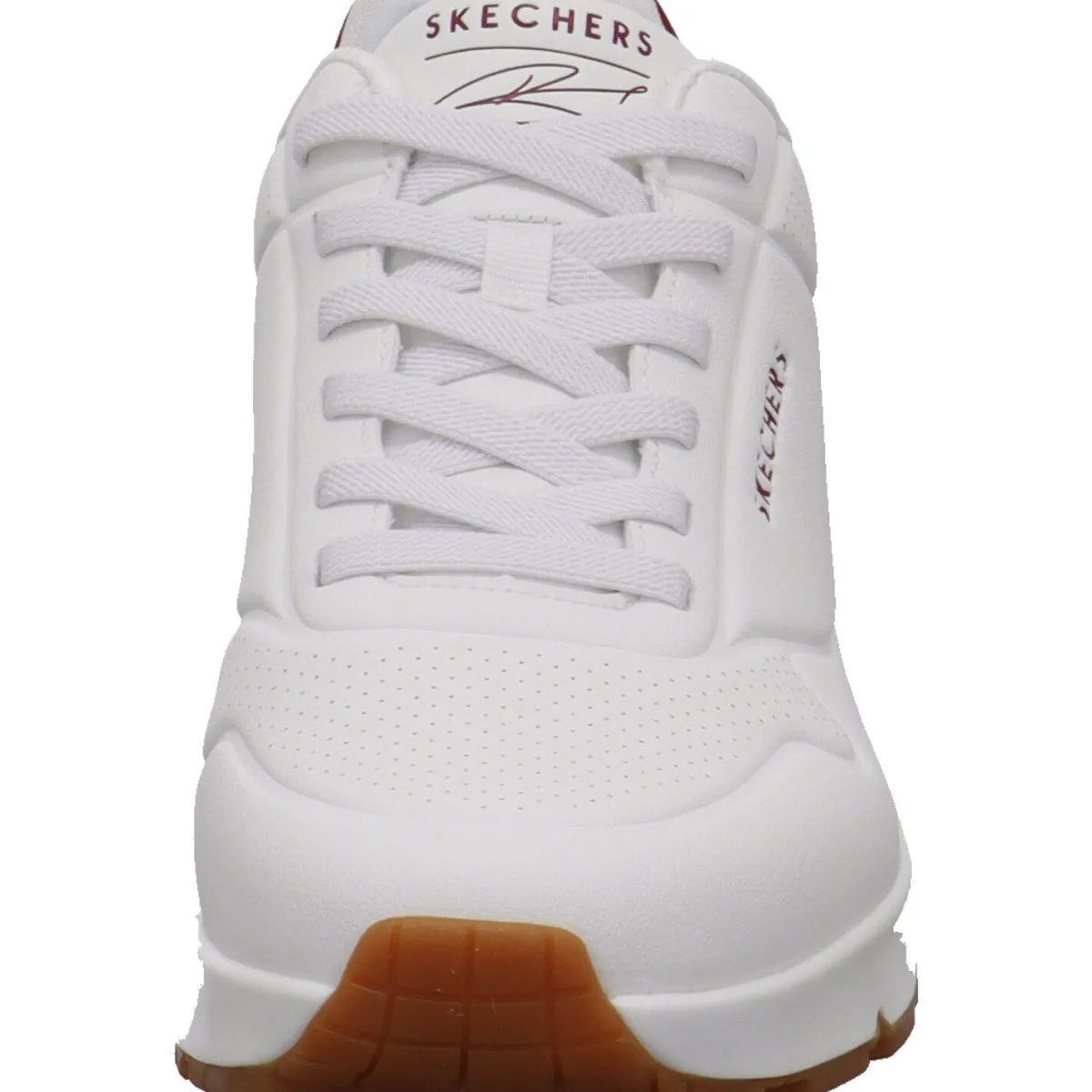 So ist das Obermaterial aus Kunstleder in Weiß an der Ferse mit einem Einsatz in Nubukleder Optik Burgundy Rot verziert. Kleine Lasercuts auf dem Obermaterial und ein Muster des Innenfutter, geben dem Schuh seinen besonderen Look.