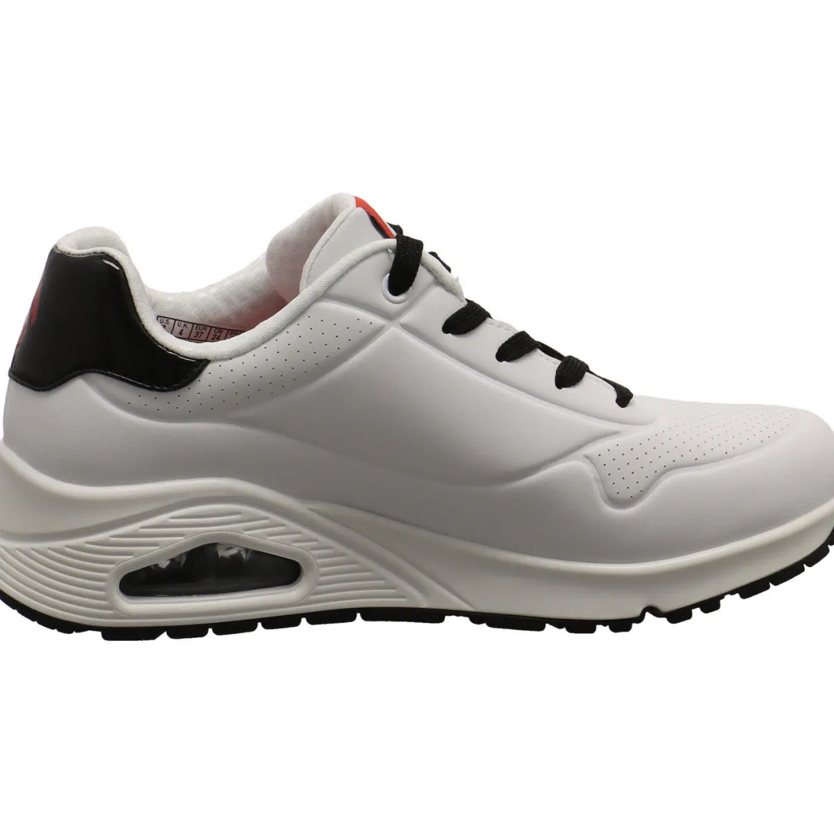 Der Lack Einsatz am Schaft in Schwarz in Kombination mit dem Skechers Logo in Rot und der Schnürung in Schwarz runden das modische Design ab.