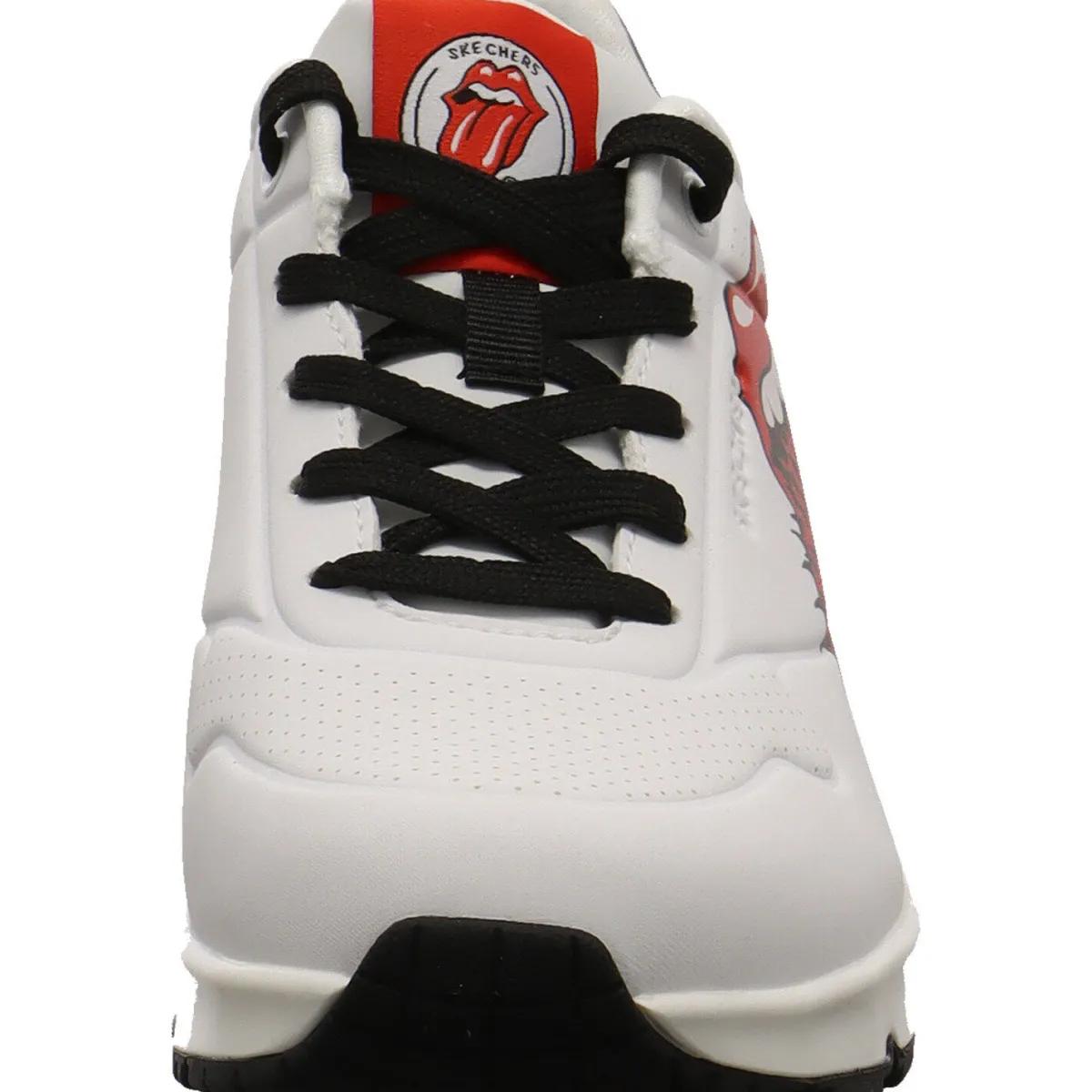 Der Schuh begeistert mit seinem hochwertigen Obermaterial aus Kunstleder in Weiß mit dem berühmten Logoprint der Rolling Stones.