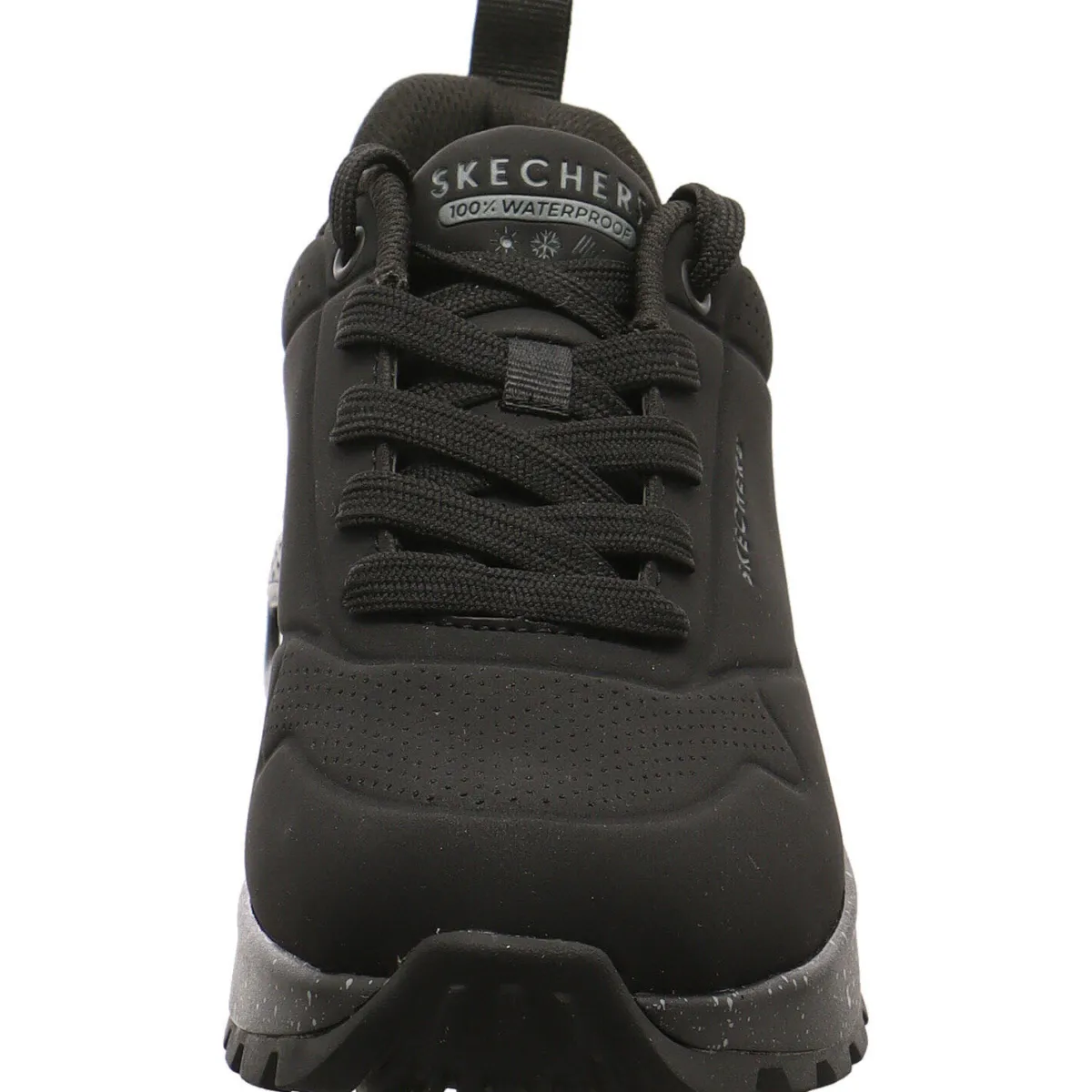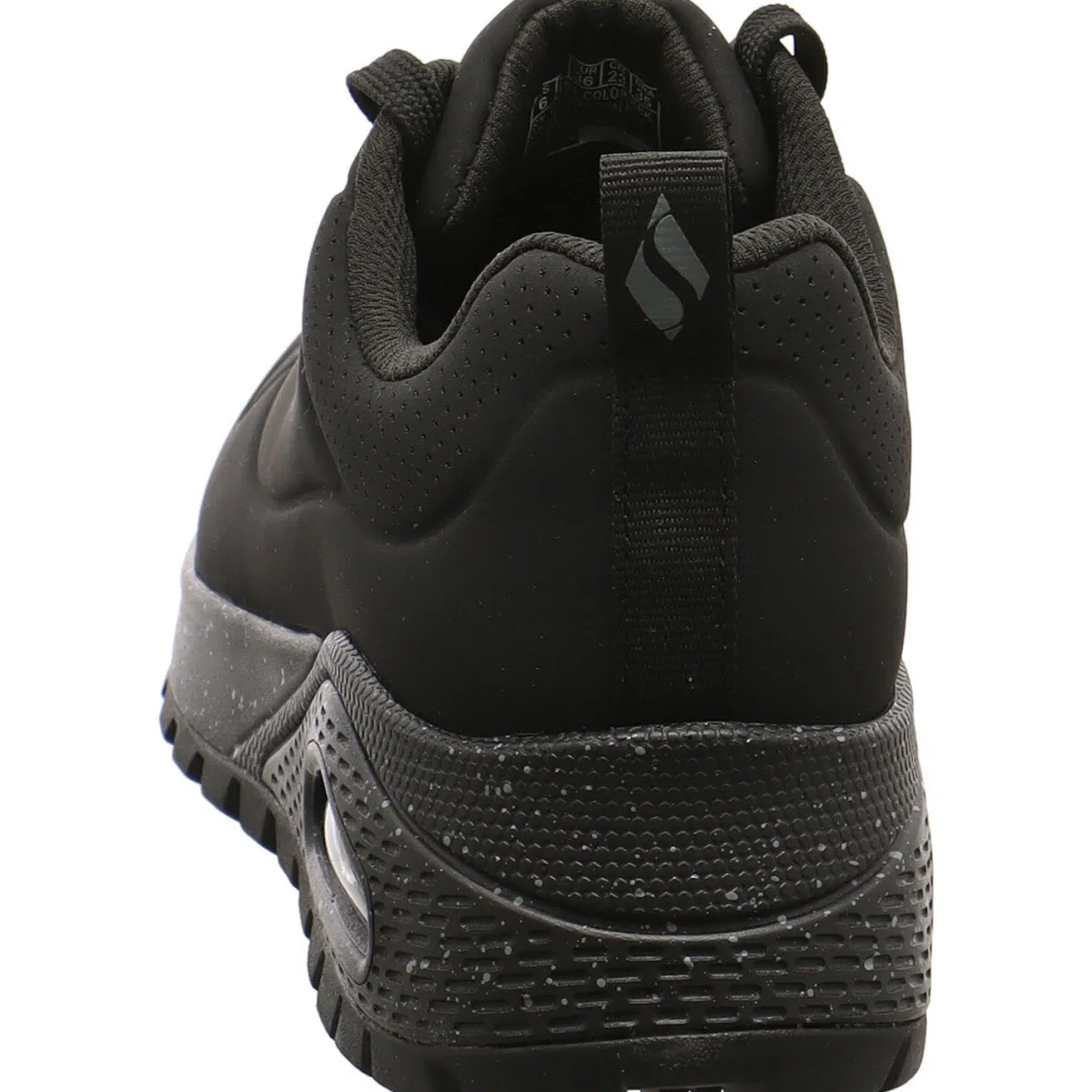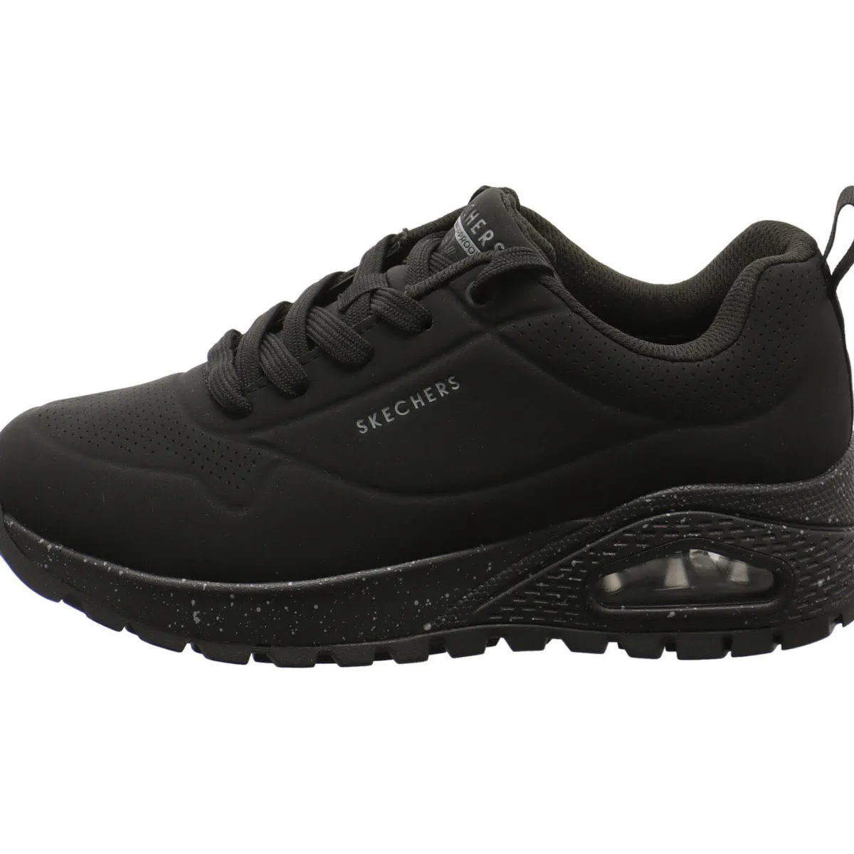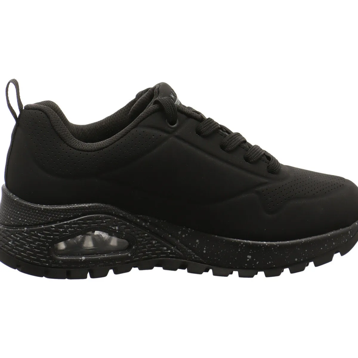 Der Damen Sneaker Uno Rugged – Spotted Terrain, von Skechers Street wurde aus Kunstleder in Schwarz gefertigt. Dabei ist das Obermaterial so gearbeitet, dass es Wasserdicht ist. Regen und nasse Wiesen sind also kein Problem. Er ist mit kleinen Lasercuts versehen. Der Schaft ist angenehm gepolstert und mit der Lasche und der Schnürung ist der Einstieg ganz leicht und die Passform kann optimiert werden. Die Air Cooled Memory Foam Innensohle passt sich dabei perfekt deiner Fußform an und sorgt für ein optimales Klima im Schuh. Auch hier findest du die integrierte Skech Air Luftkissen-gedämpfte Zwischensohle. Der ideale Begleiter auch bei Schmuddelwetter.