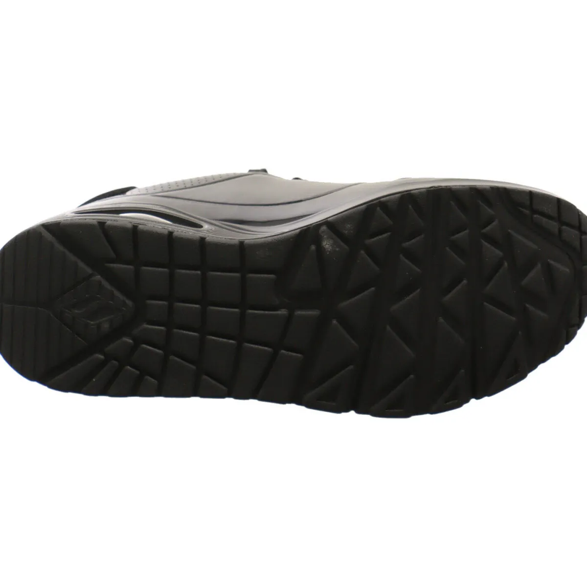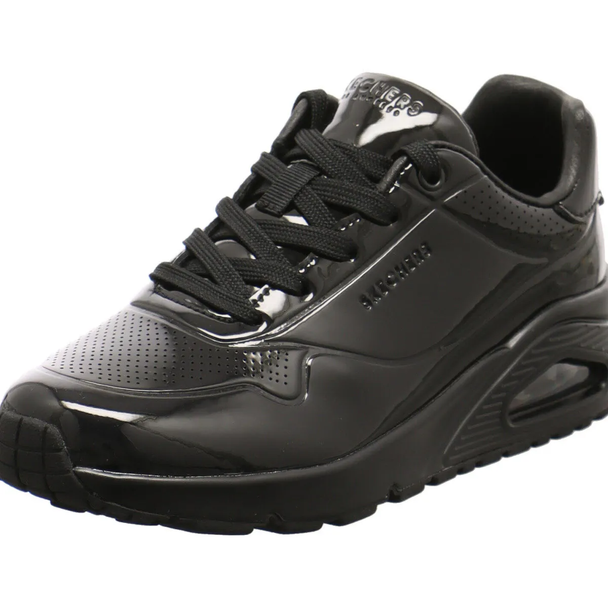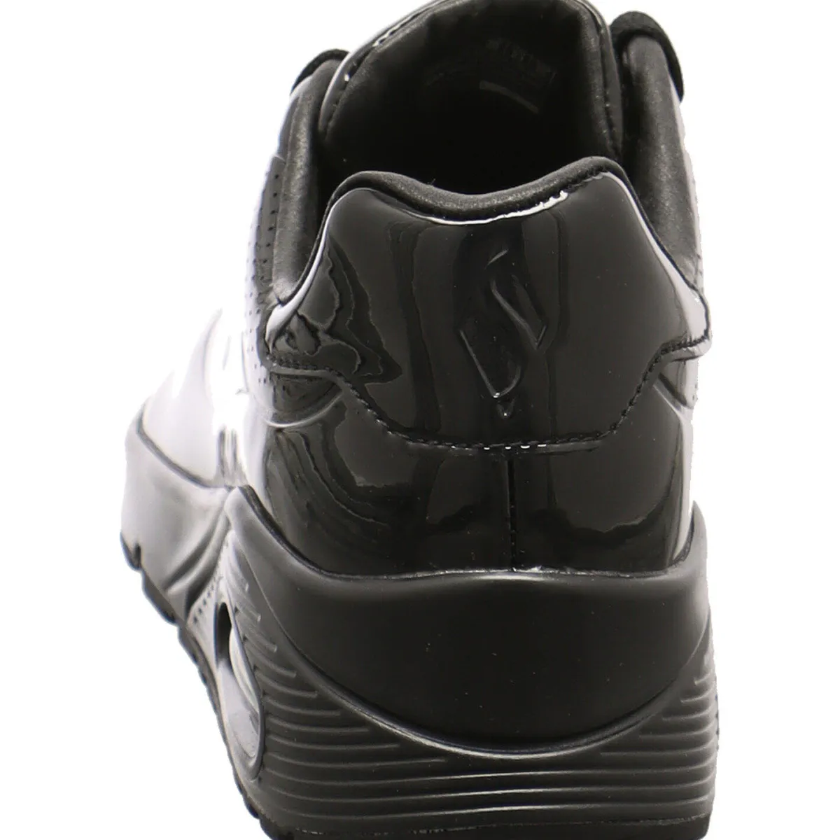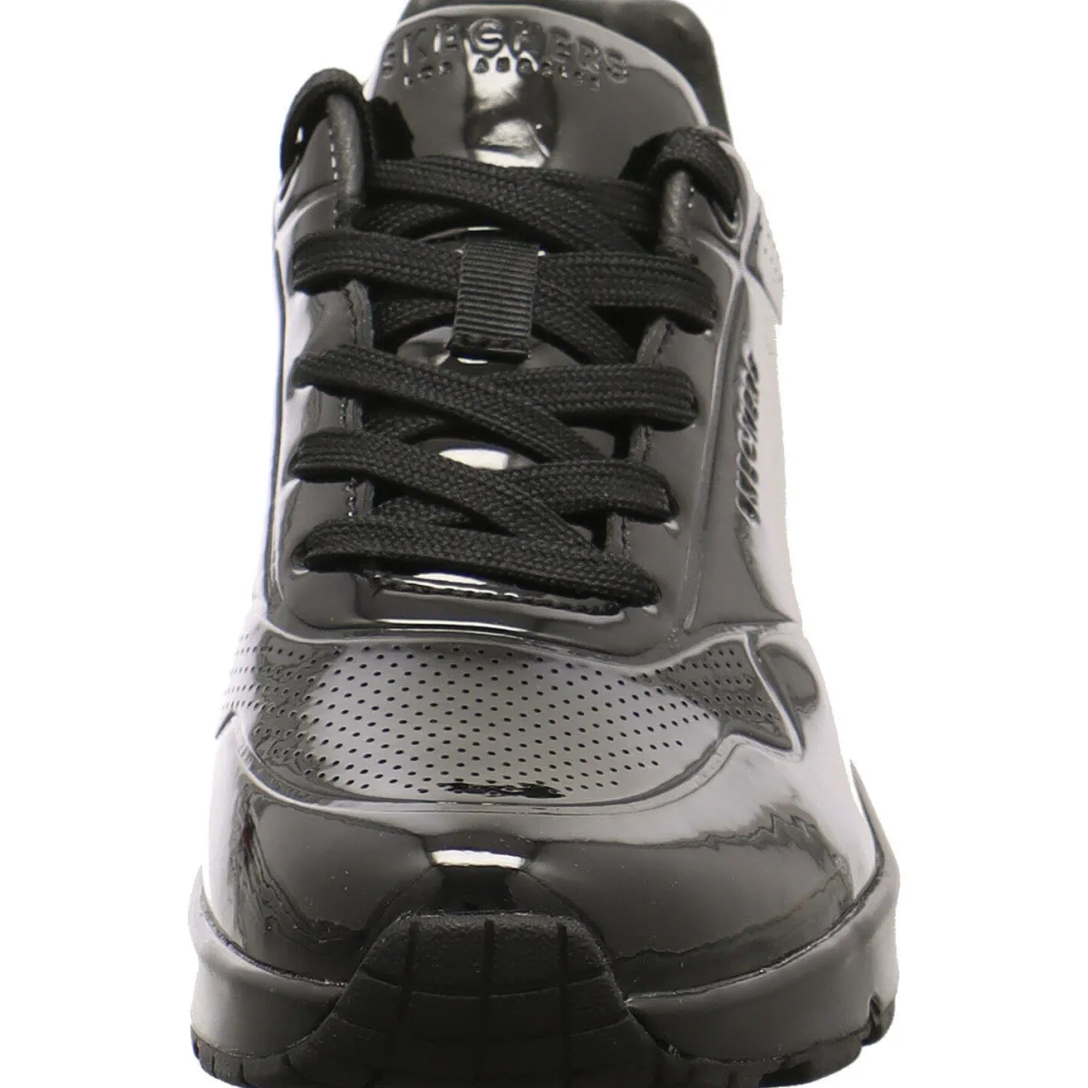 Das Obermaterial aus Kunstleder ist in einem klassischen Schwarz in Lack Optik gestaltet und wird mit Ziernähten und Perforations-Akzenten optisch aufgewertet.