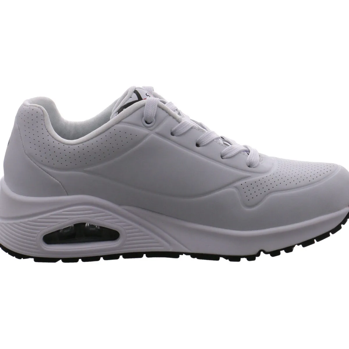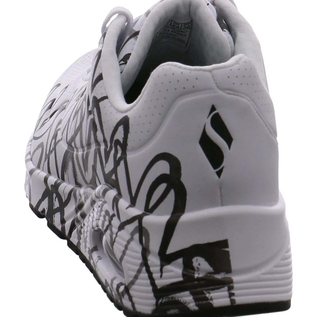 Das Obermaterial aus Kunstleder in Weiß ist mit einem tollen Herzmuster in Schwarz versehen. Das auffällige Design des Sneaker ist aus der Zusammenarbeit des international bekannten Wandmalers James Goldcrown und Skechers entstanden.