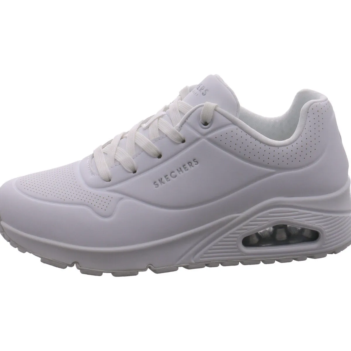 Das Obermaterial aus Kunstleder ist in einem vielseitigem Weiß gestaltet und wird mit Ziernähten und Perforations-Akzenten optisch aufgewertet.