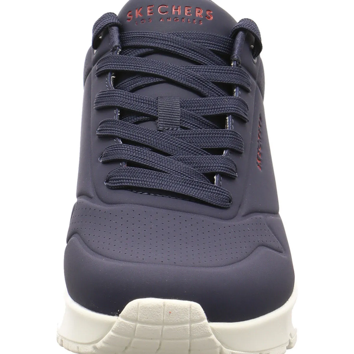 Der Schuh begeistert durch seinen modischen Look, durch das Kunstleder in Blau. Als Highlight, sind auf dem Blatt und seitlich vom Schaft kleine Lasercuts angebracht. Die Rückseite vom Schaft ist Rot abgesetzt. Die Skechers Air-Cooled Memory Foam Innensohle und eine sichtbare luftgepolsterte Skech-Air Zwischensohle sorgen für optimalen Komfort. Der Schaft ist angenehm gepolstert und durch die Schnürung kann der Schuh perfekt an den Fuß angepasst werden.
