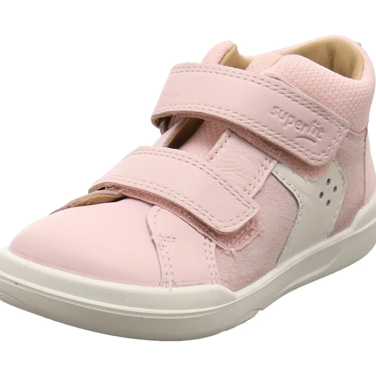 Das Obermaterial aus einem Mix aus hochwertigem Glattleder und weichem Veloursleder in Rosa ist sehr hochwertig verarbeitet. Details in Weiß und ein kleines Textilband in Blau runden das modische Design gekonnt ab.