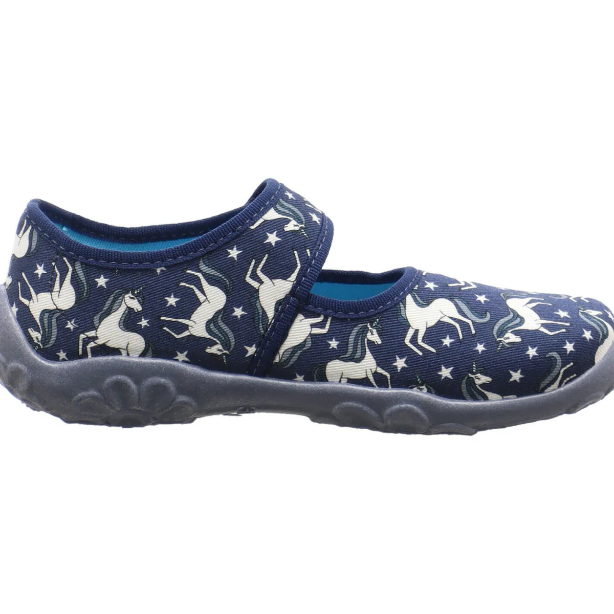 Gefertigt aus Textil in Blau mit einem süßen Einhornmuster, bietet er schon kleinen Füßen besten Komfort und begeistert jedes Mädchen.