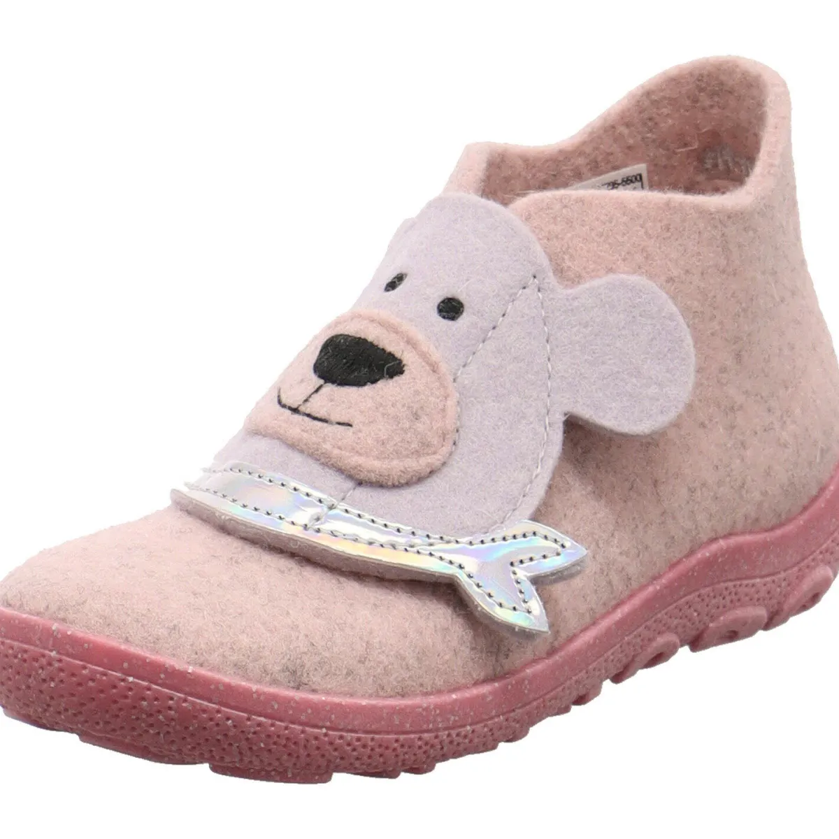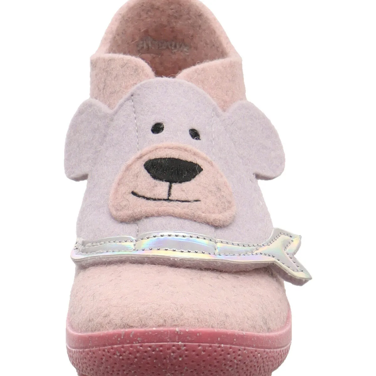 Der Klettverschluss, der unter dem Bärenkopf versteckt ist, ermöglicht ein einfaches An- und Ausziehen und die flexible Laufsohle ist perforiert und dadurch atmungsaktiv.