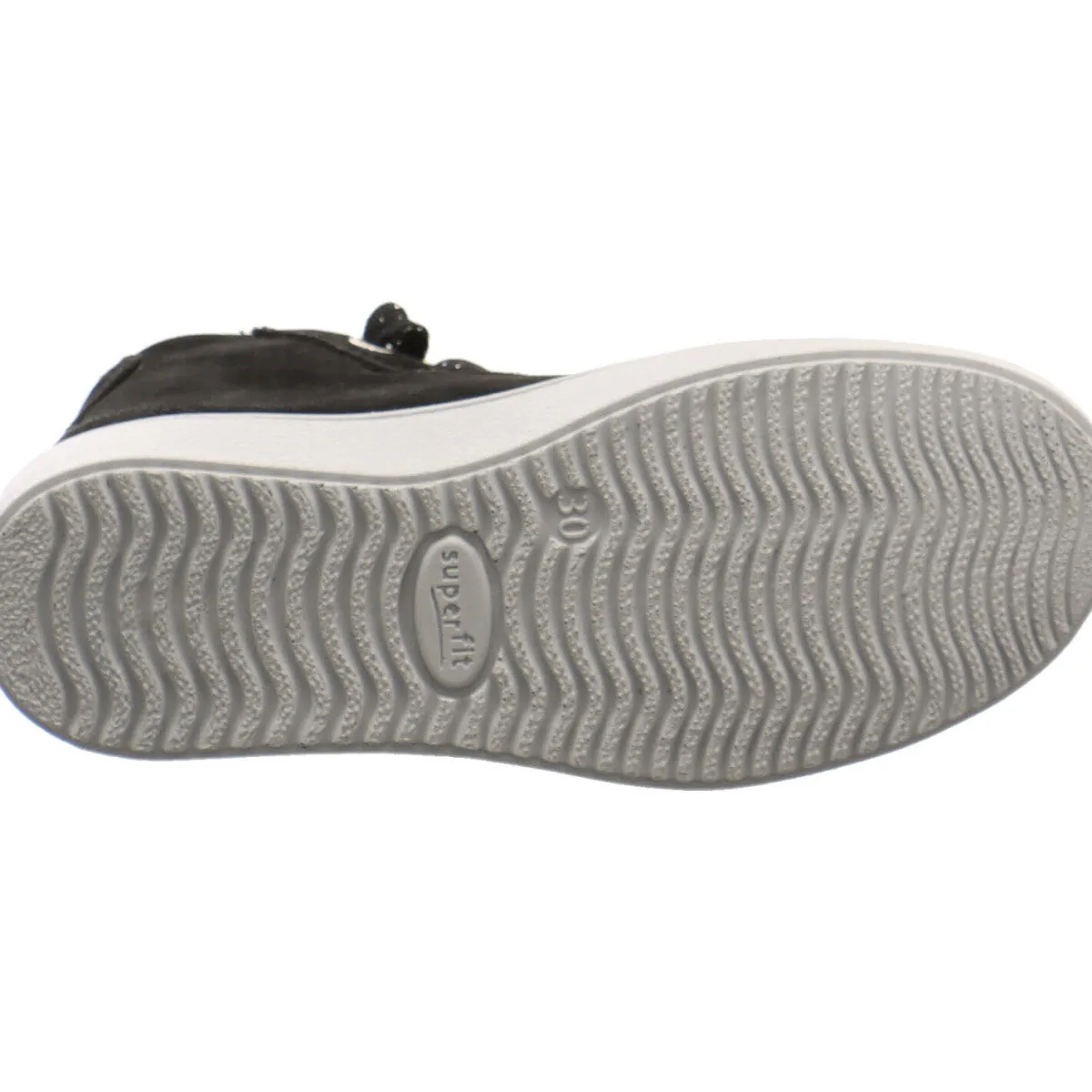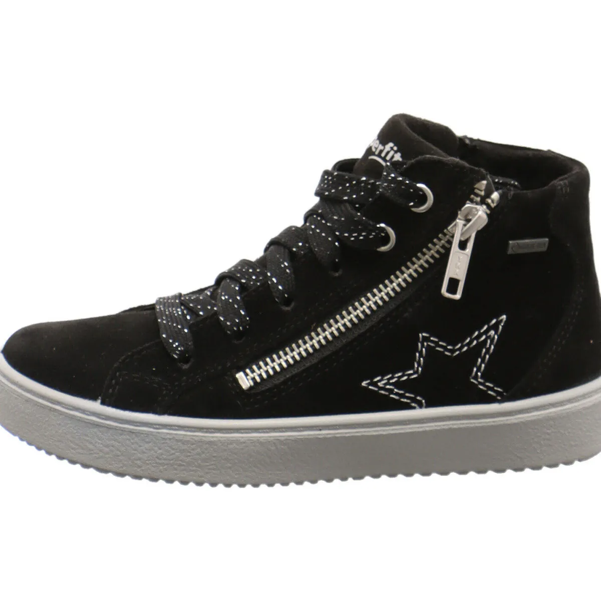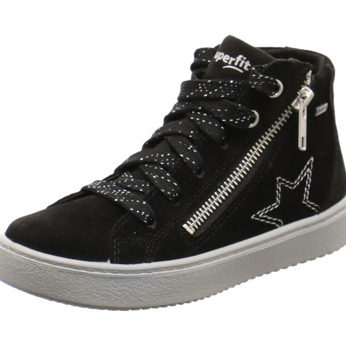 Durch den seitlichen Reißverschluss und die Schnürung in Schwarz mit Glitzer ist ein leichter Ein- und Ausstieg gewährleistet. Der Schuh ist mit der bewährten Gore-Tex Membran ausgestattet, dadurch ist er wasserdicht. Durch das nur leichte Innenfutter ist er der ideale Begleiter für den Übergang.