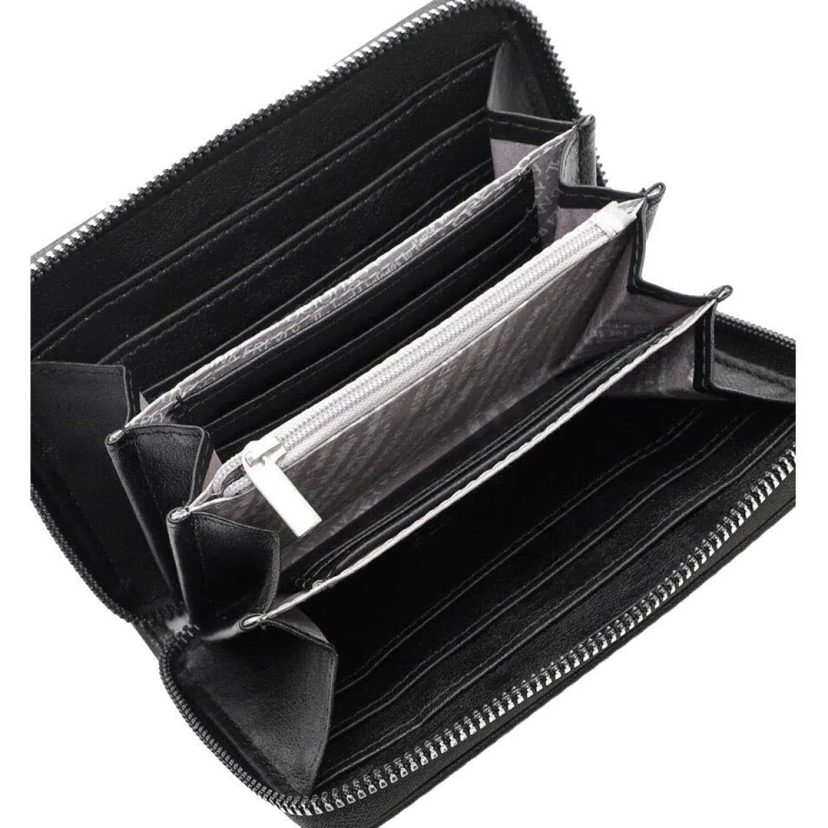 Das Portemonnaie lässt sich durch einen umlaufenden Reißverschluss öffnen und schließen. Das Innenleben besteht aus großen Fächern für Geldscheine und zahlreichen kleinen Fächern für Karten und Ähnliches. Für Kleingeld verfügt die Börse über ein separates Fach mit Reißverschluss.