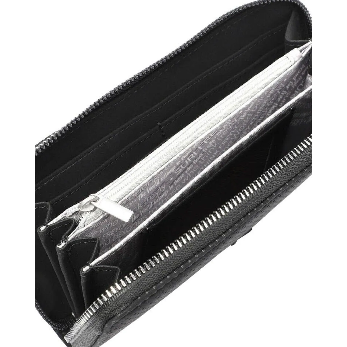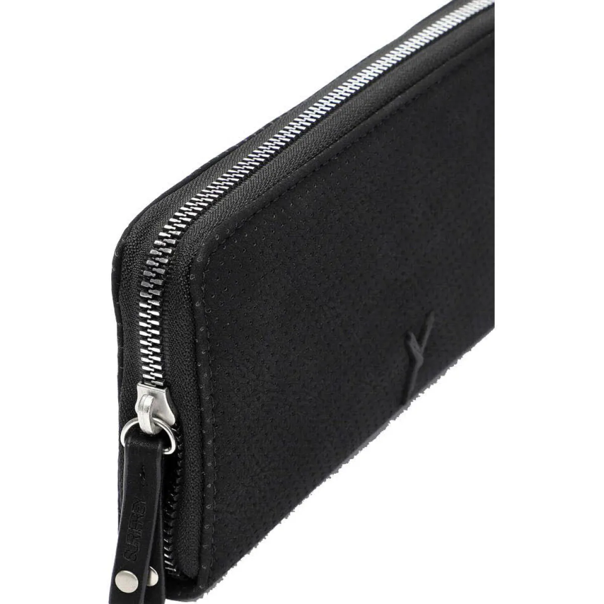 Das Obermaterial wurde aus Kunstleder gefertigt und mit vielen kleinen Lasercuts versehen. Das Portemonnaie lässt sich durch einen umlaufenden Reißverschluss öffnen und schließen. Das Innenleben besteht aus großen Fächern für Geldscheine und zahlreichen kleinen Fächern für Karten und Ähnliches. Für Kleingeld verfügt die Langbörse über ein separates Fach mit Reißverschluss.