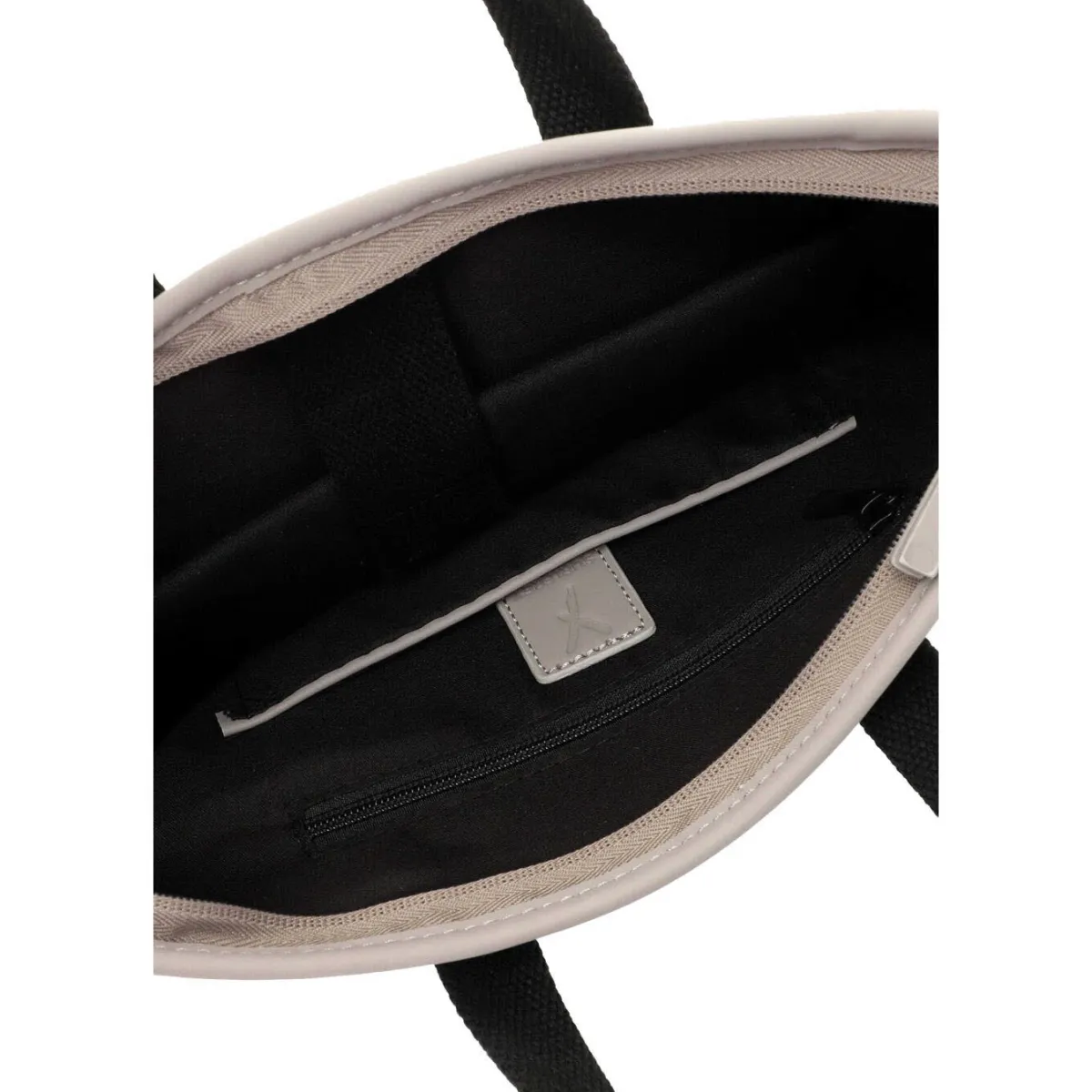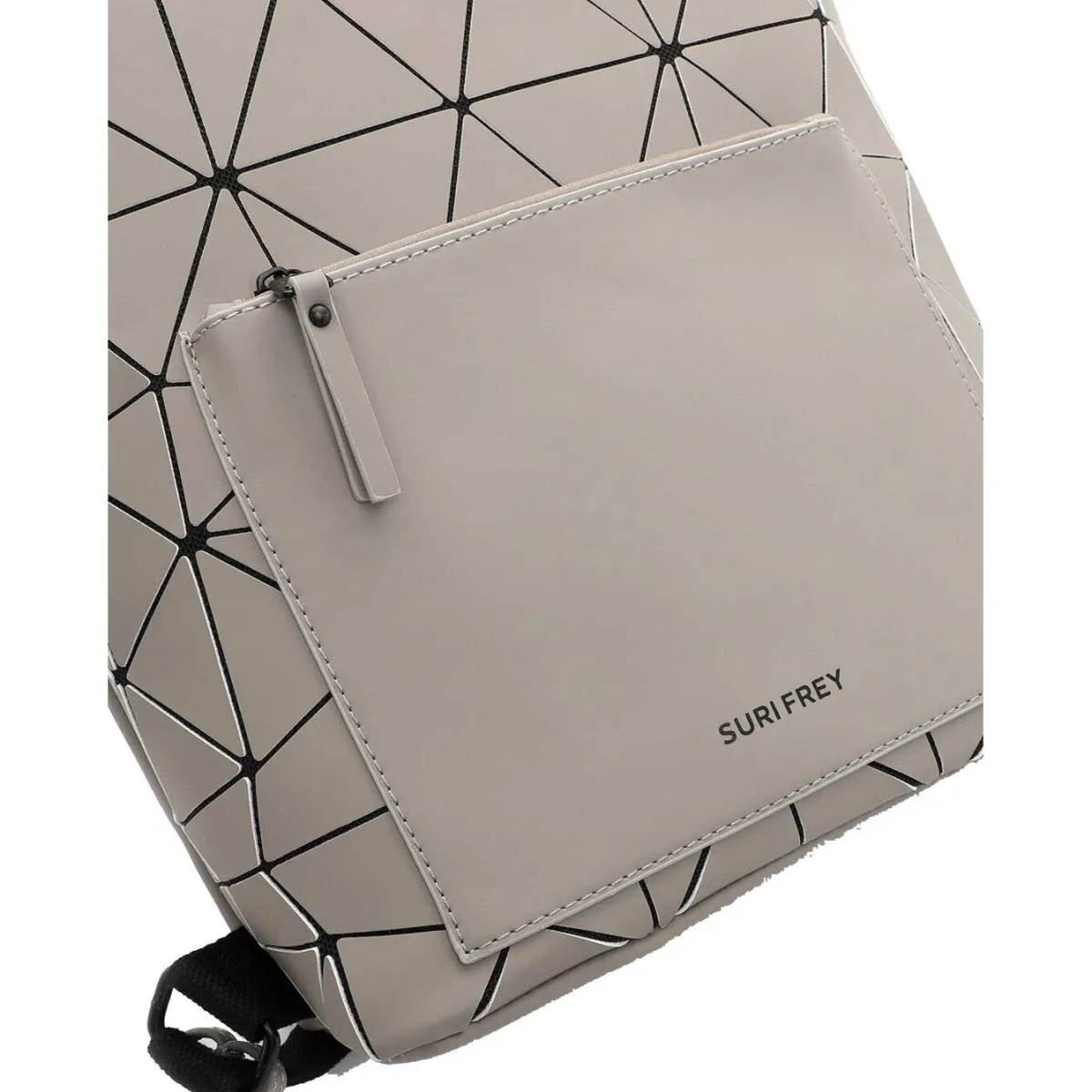 Das Obermaterial aus Kunstleder erhält durch das Geometrische Muster in Taupe Grau eine stylische Mix-Optik und macht den Rucksack zum absoluten Hingucker.