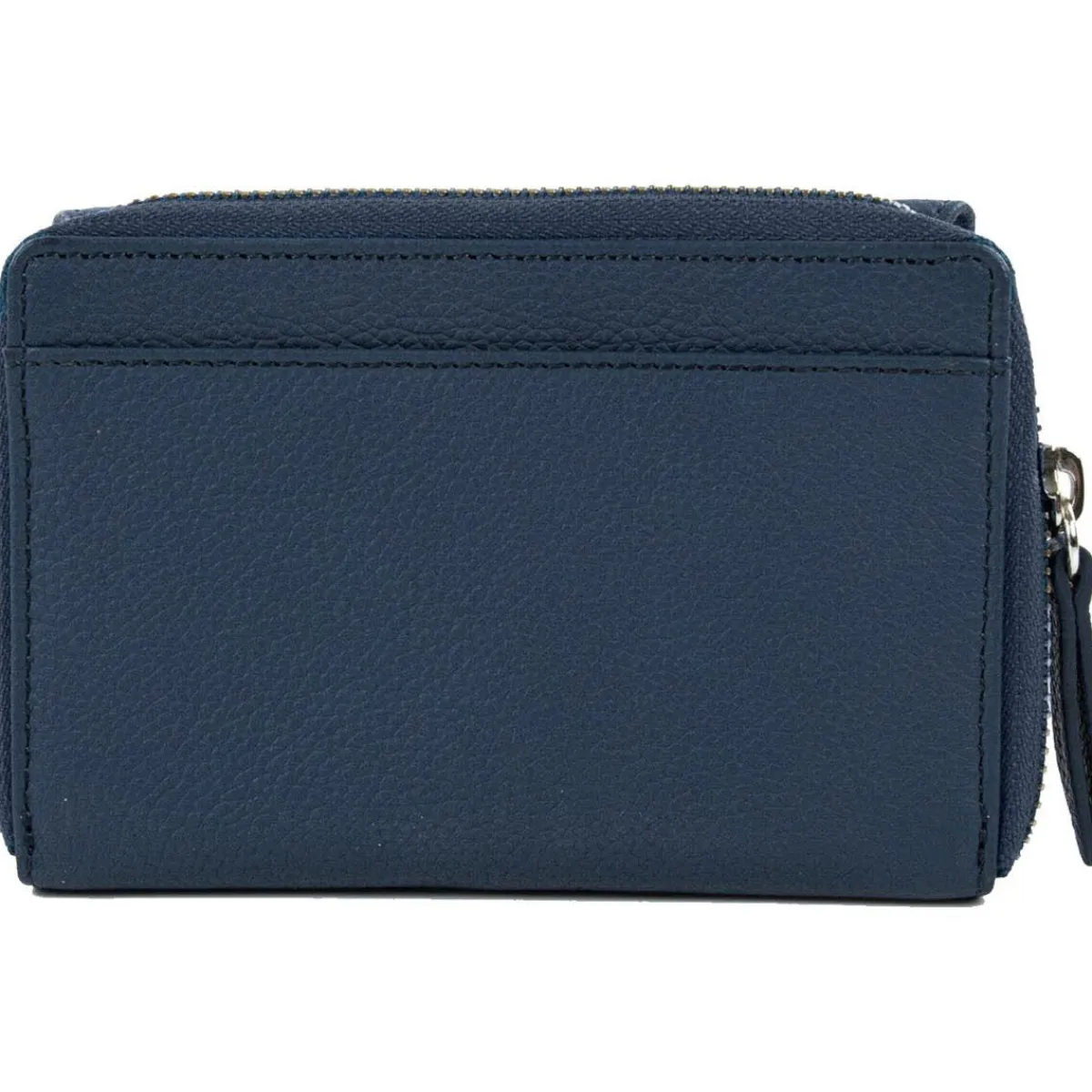 Ein Fach lässt sich durch einen umlaufenden Reißverschluss öffnen und schließen und bietet Platz für Kleingeld. Ein zweites Fach wird mit einem Druckknopf geöffnet und geschlossen und bietet Platz für Geldscheine und zahlreiche kleine Fächer für Karten und Ähnliches.