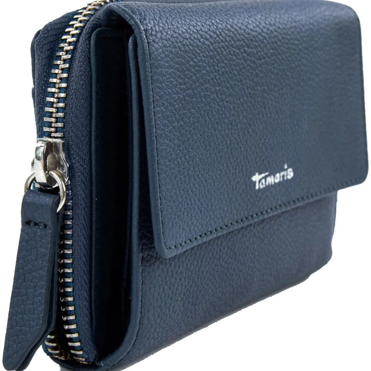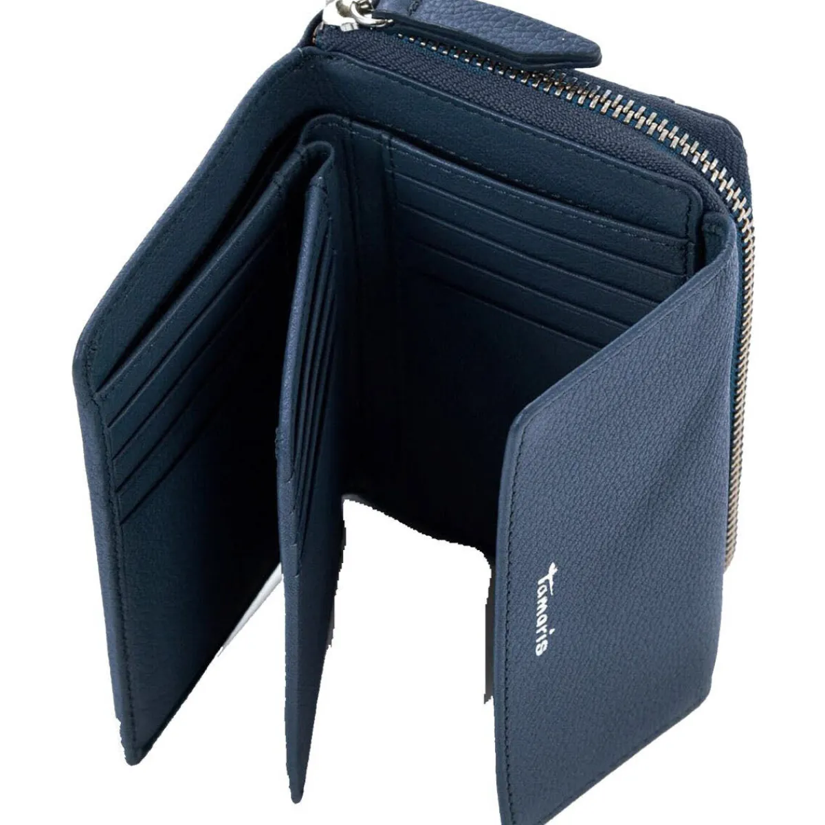 Gefertigt aus authentisch genarbtem Echtleder in Blau ist sie mit dem Tamaris Logo versehen.