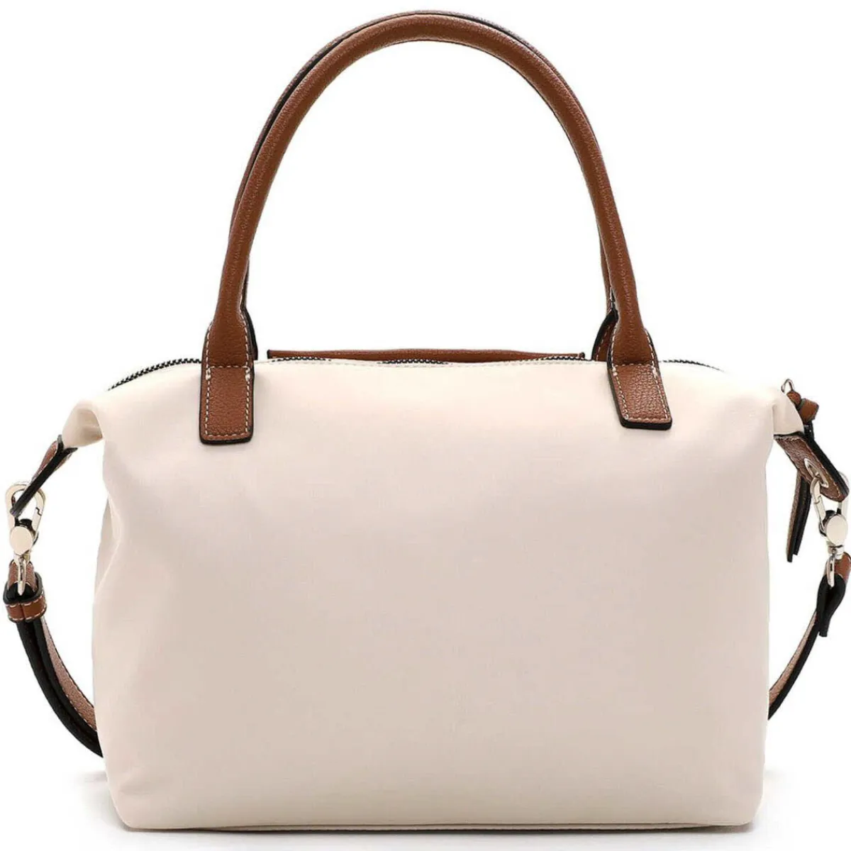 Die Handtasche wurde aus pflegeleichtem Polyester in Beige gefertigt und mit Details aus Kunstleder in Cognac Braun versehen. Die Tasche ist durch ihr stilvolles Design ein besonderer Blickfang und begleitet dich besonders edel in der Freizeit und ins Büro.